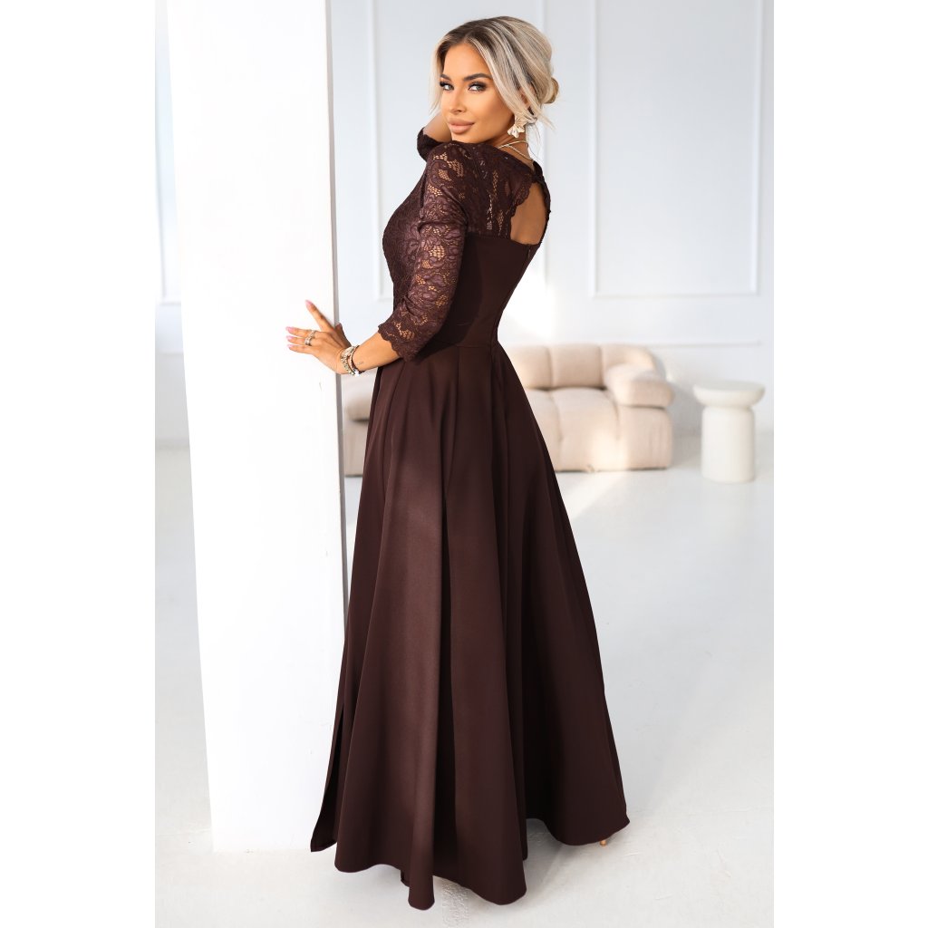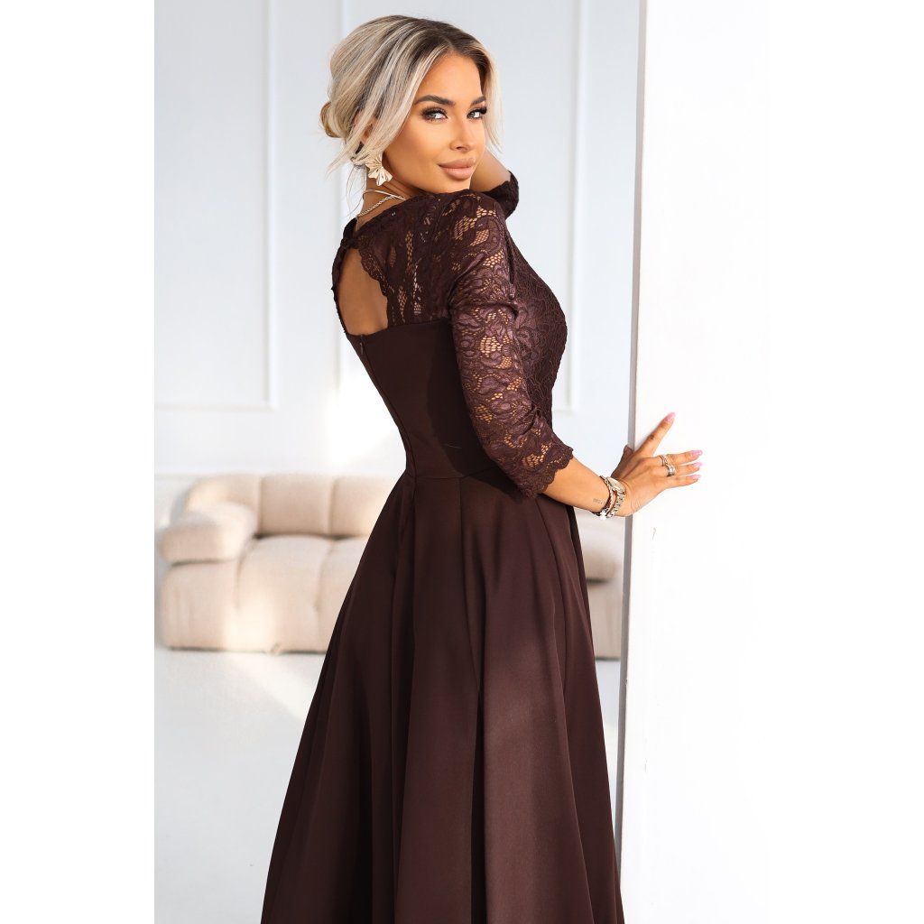 AMBER elegantní dlouhé krajkové šaty s výstřihem - čokoládové 309-14