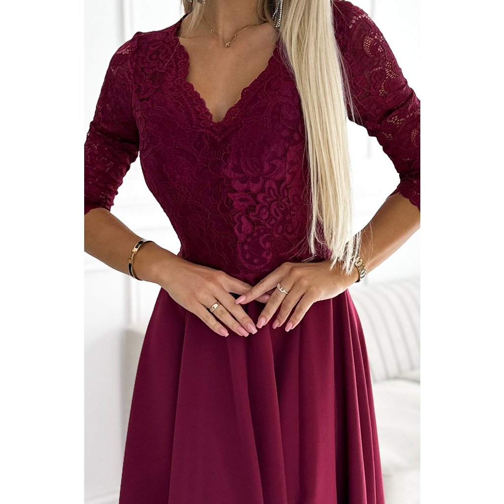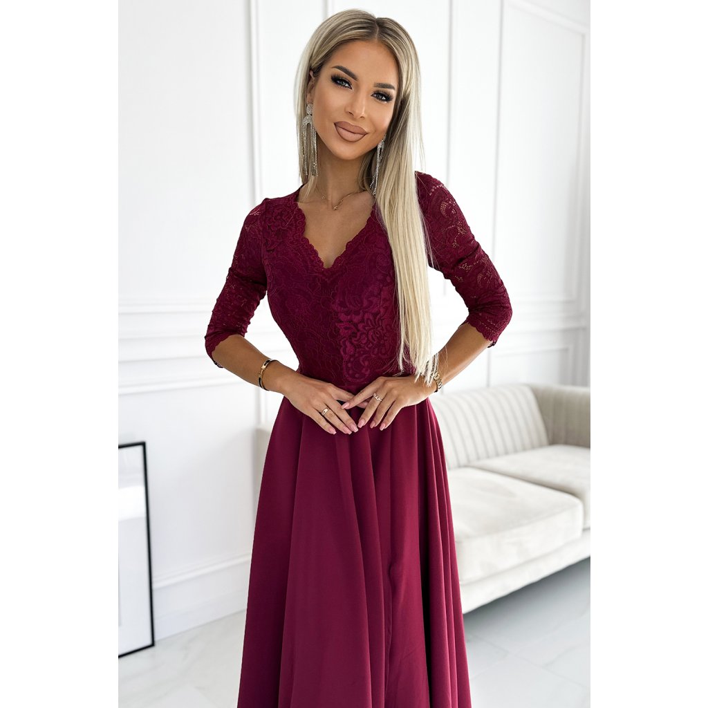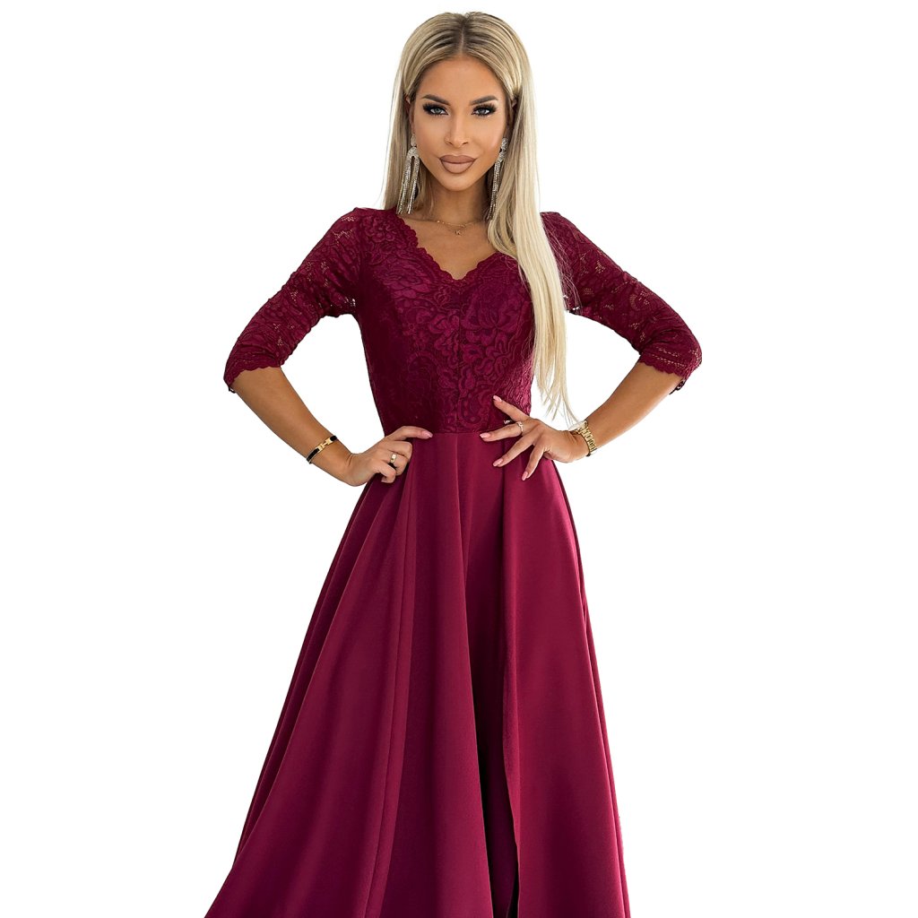 AMBER elegantní dlouhé maxi šaty s krajkovým výstřihem - vínové 309-9