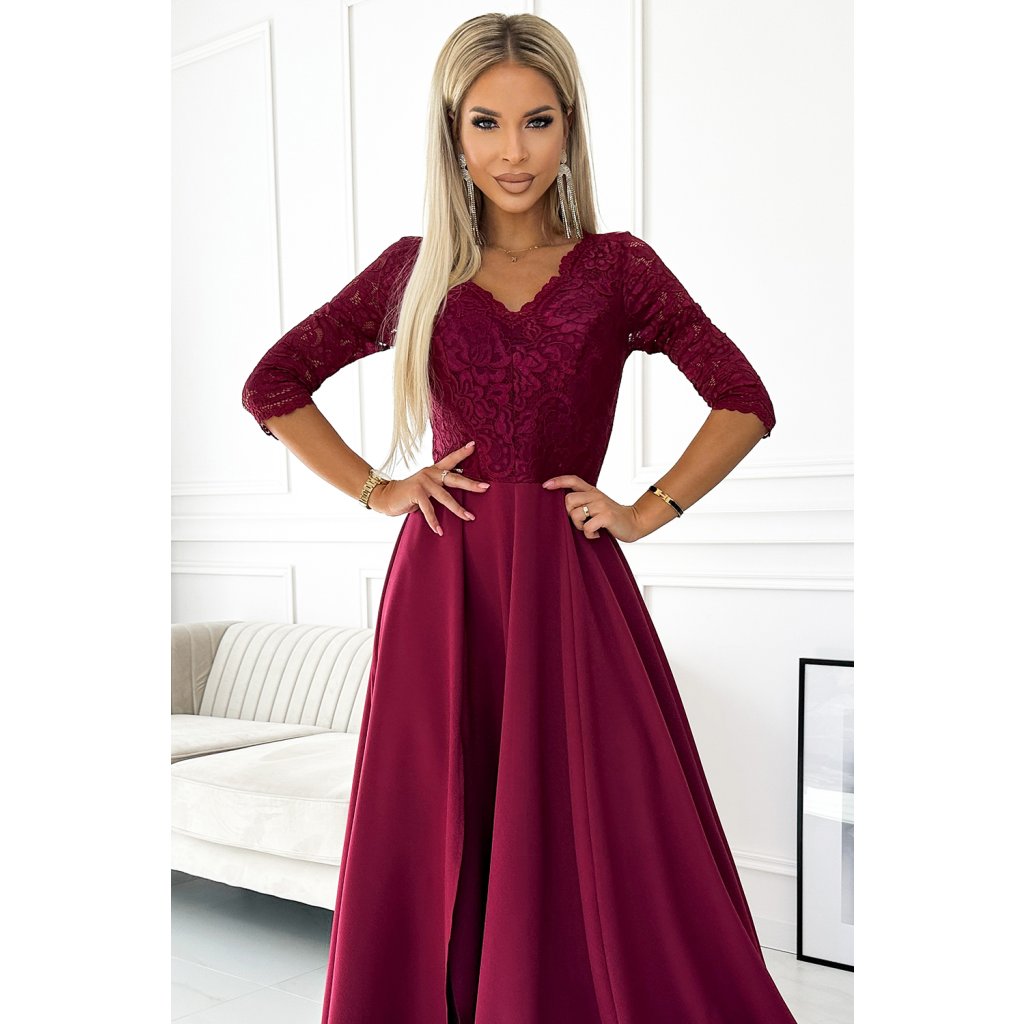 Amber - elegantní, dlouhé, maxi šaty s krajkovým výstřihem. Rozparek na sukni a krajkový top vytváří neobvyklý vínový outfit. Polská výroba. Značka Numoco.