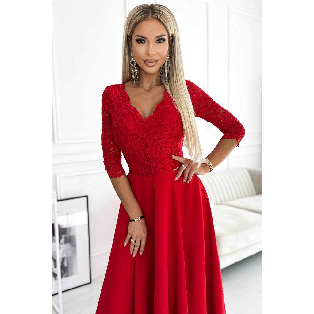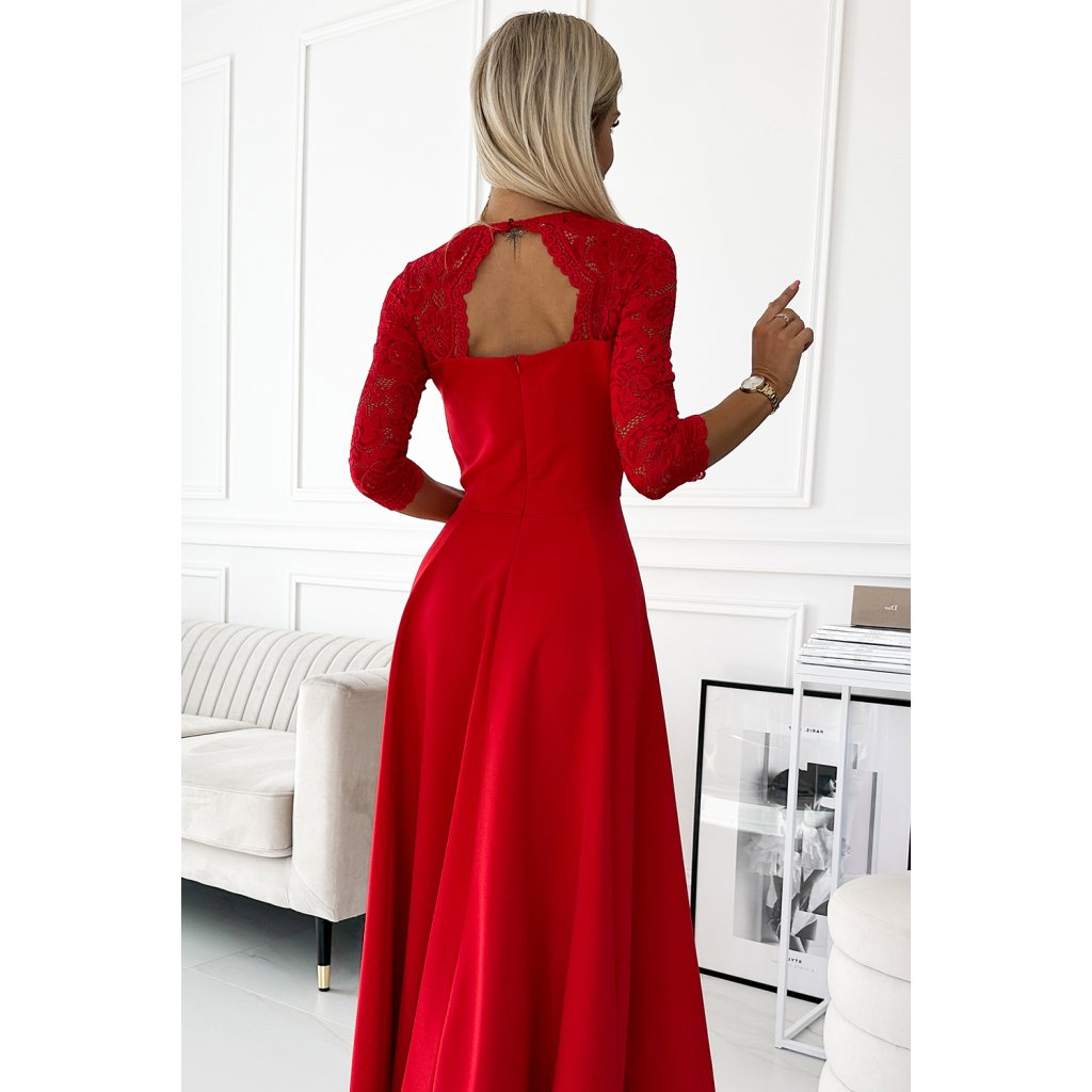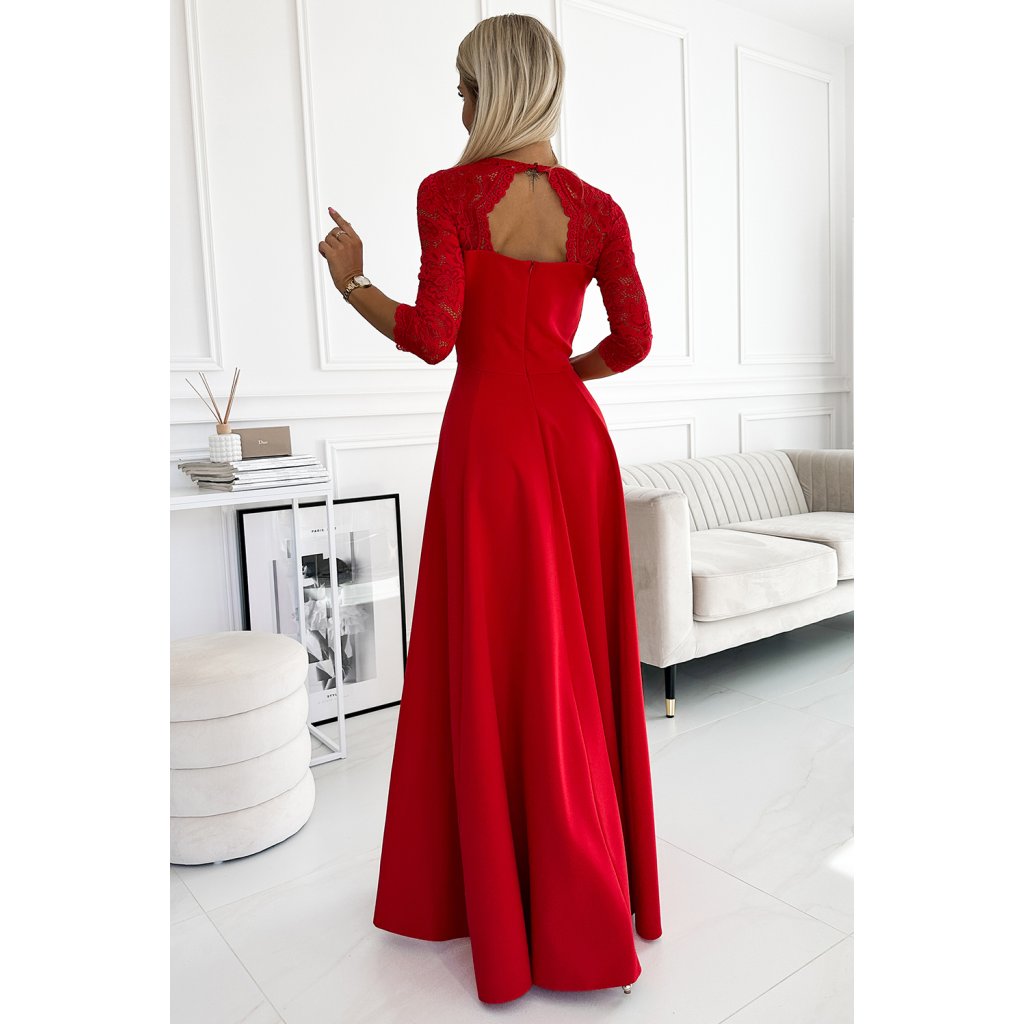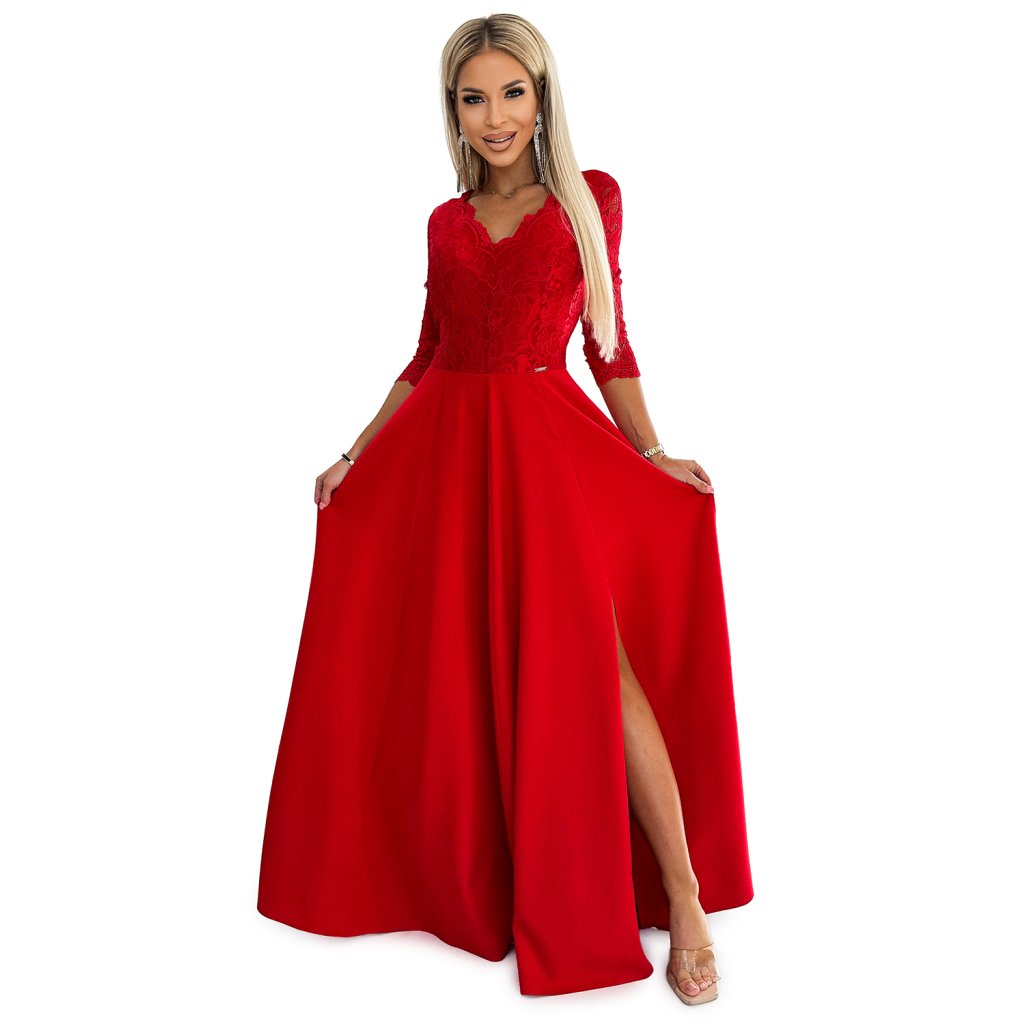 AMBER krajkové, elegantní dlouhé šaty s výstřihem a rozparkem u nohavic - červené 309-8