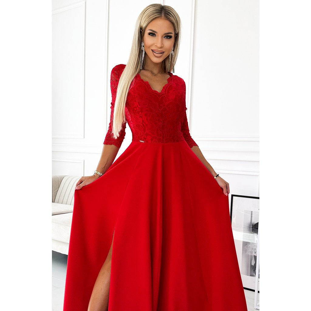 Amber - dlouhé, elegantní, krajkové, maxi šaty s výstřihem. Krásně tvarovaný výstřih a rozparek na sukni vytvářejí neobvyklý červený outfit. Perfektní šaty na svatbu, Silvestra, karneval, ples a další významné události. Polská výroba. Značka Numoco.