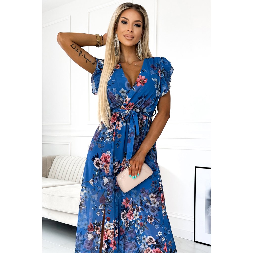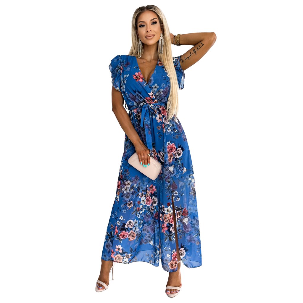 ARIA - Dlouhé šifonové šaty s psaníčkovým výstřihem, páskem a krátkými rukávy. Vzor: květiny na modrém pozadí. Značka Numoco. evropská produkce.