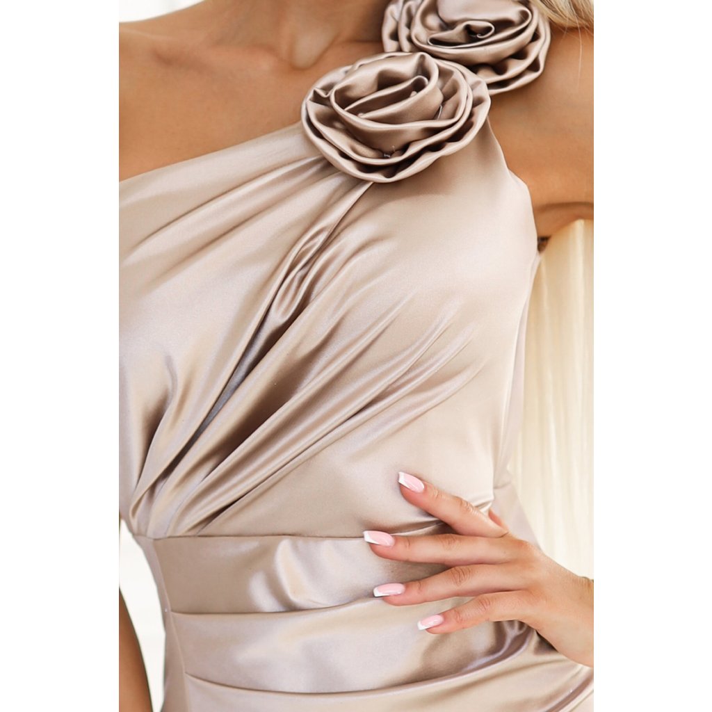 AURORA dlouhé saténové šaty na jedno rameno s růžemi - béžová barva 580-1