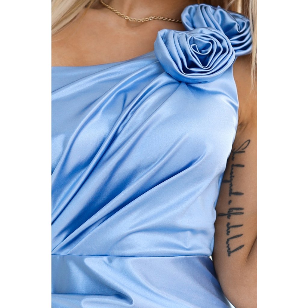 AURORA dlouhé saténové šaty na jedno rameno s růžemi - světle modrá barva 580-4