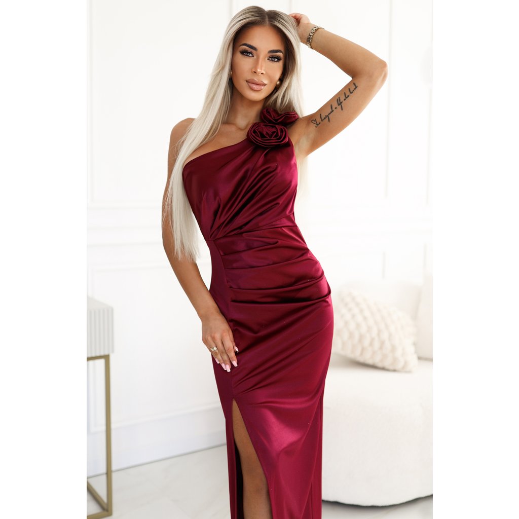 Saténové dlouhé šaty na jedno rameno zdobené krásnými růžemi, které dodávají outfitu jedinečný charakter. Šaty mají rozparek u nohavic a řasení v pase a na poprsí, které zdůrazňují postavu a dodávají eleganci. Vyrobeno z kvalitního saténového materiálu v syté vínové barvě. Ideální pro formální příležitosti.