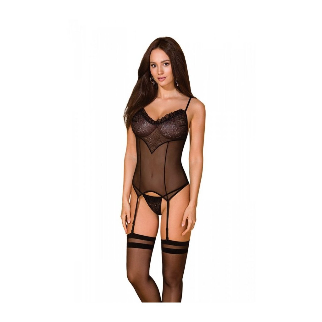 Černý korzet Odrevia spojuje hladký průhledný materiál s černou krajkou s jemným vzorem. Volánky připoutají pozornost k výstřihu. Tanga jsou ze stejné krajky, která zdobí horní část korzetu.