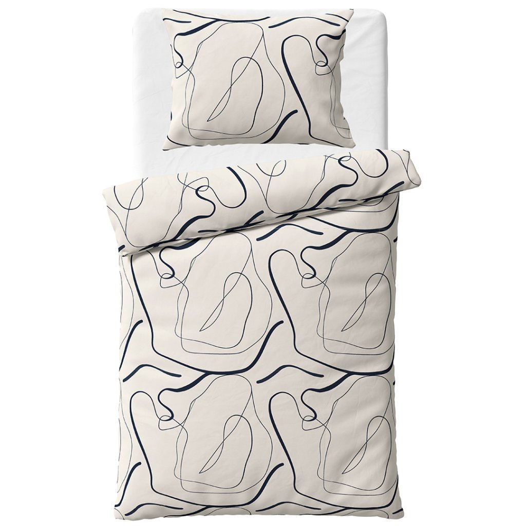 Toto bavlněné povlečení kombinuje jemné krémové tóny s decentním tmavě modrým vzorem, díky čemuž působí čistě, sofistikovaně a nadčasově