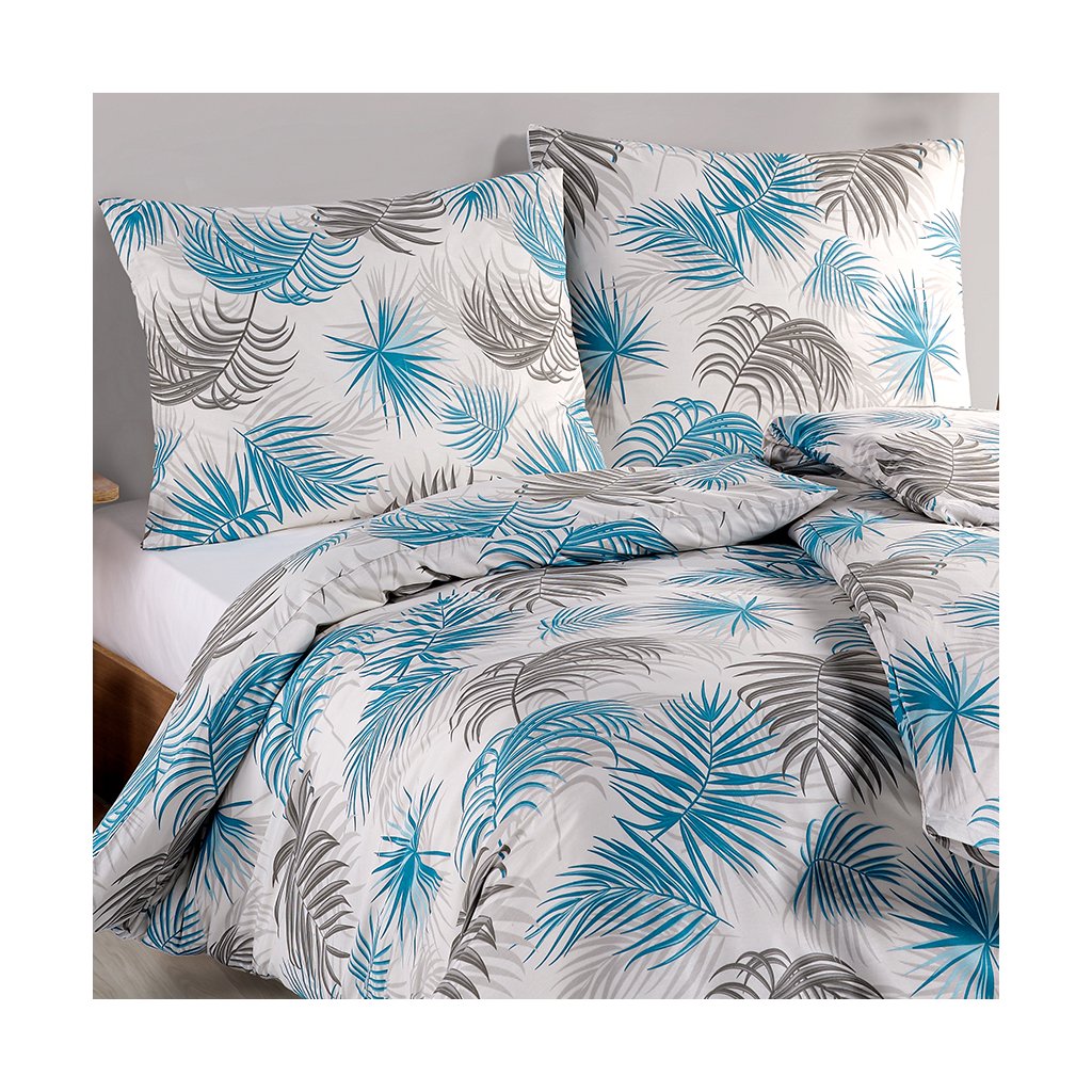 Palmové listy jsou v odstínech modré a šedé barvy a různě se na povlečení naklánějí a rozvětvují