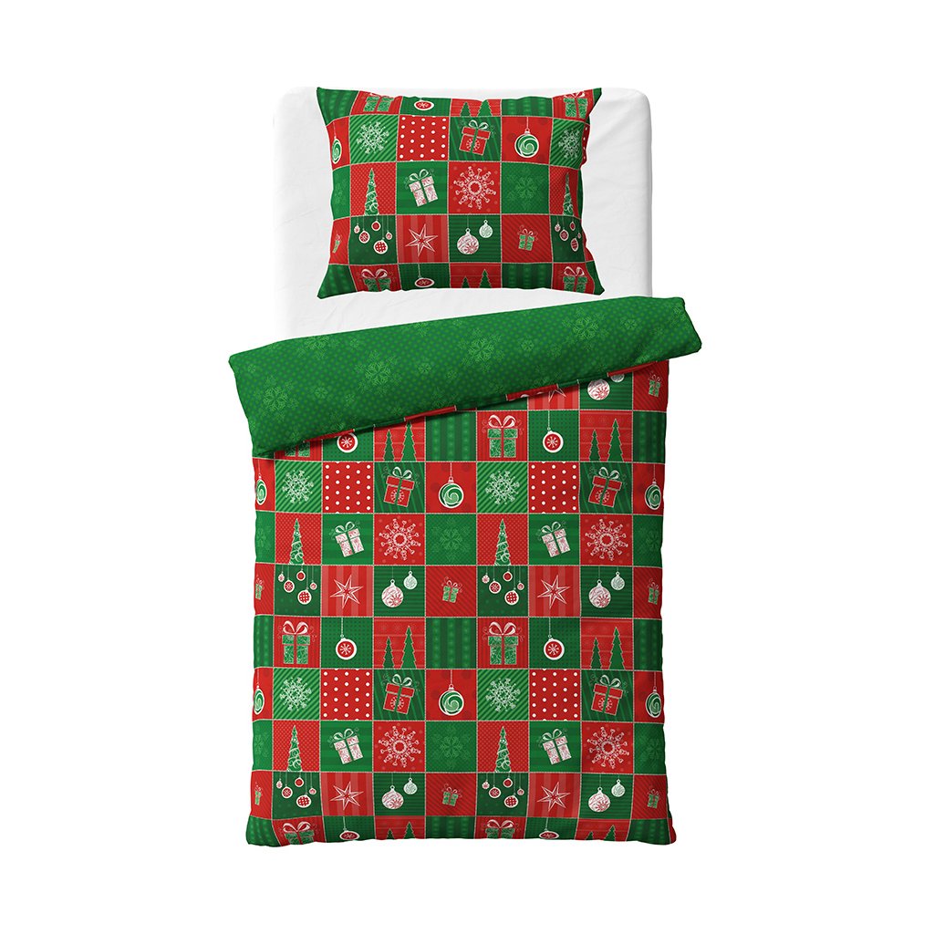 Rubová strana povlečení je laděná do zelené barvy a jsou na ní jemné vzory vloček, které příjemně ladí s lícní stranou