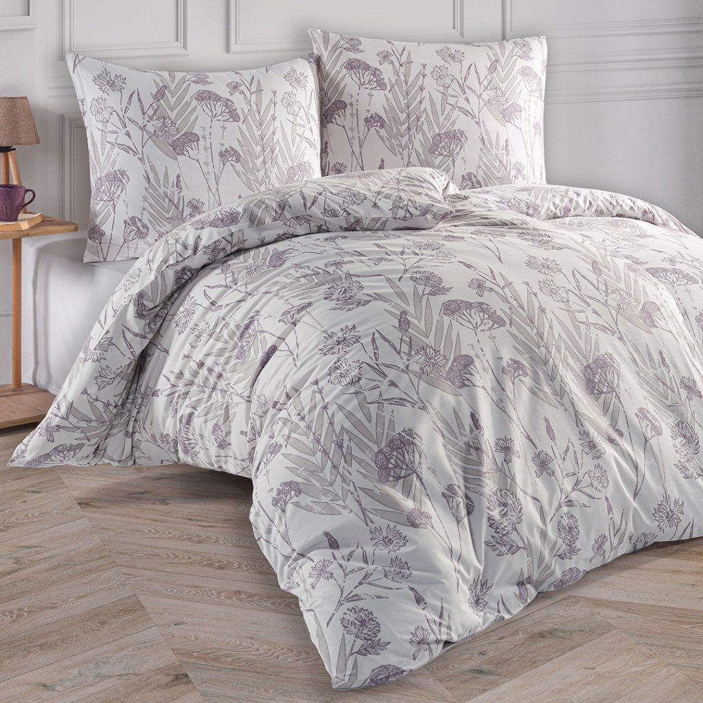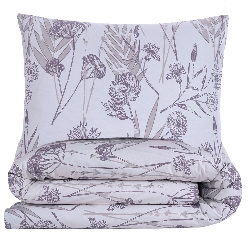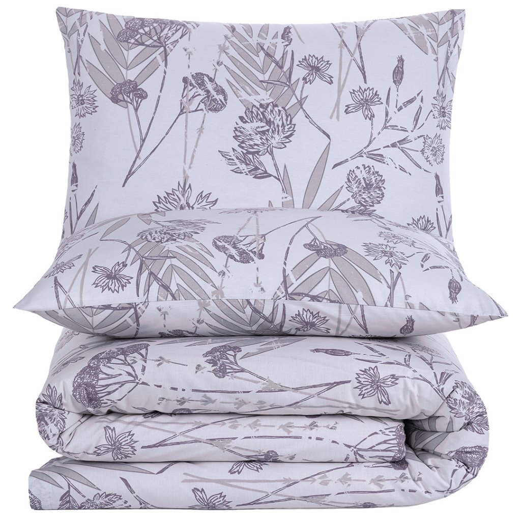 Květy v jemných fialkových barvách doplněny šedými listy působí nenásilně a noblesně a celé povlečení tak působí elegantně a vzdušně
