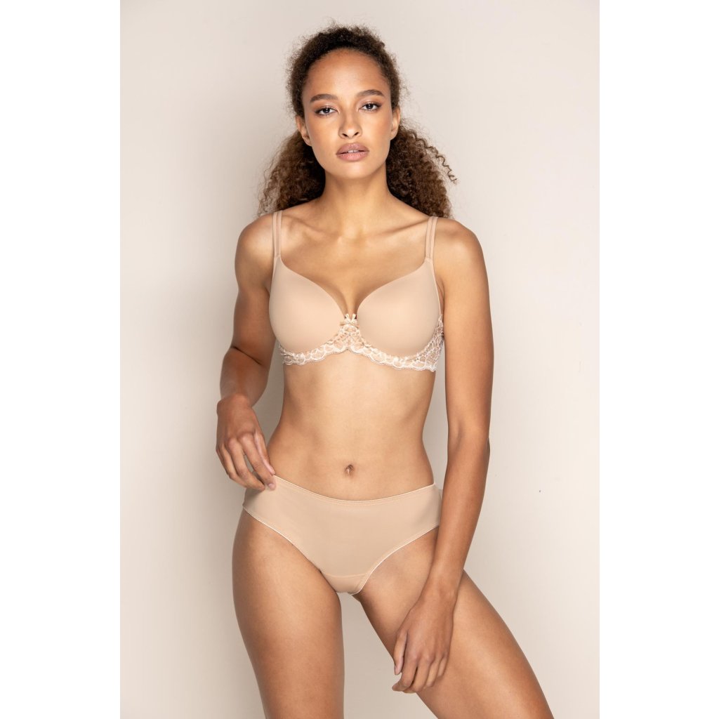 Podprsenka LovelyBra z kolekce Sand Dune v jemném pískovém odstínu s nízkým středem umožňuje odhalit dekolt. Krajka je našita zespodu košíčků i na sedle a tím nezasahuje do hladkosti košíčku. Svým střihem je vhodná pro menší a střední prsa.