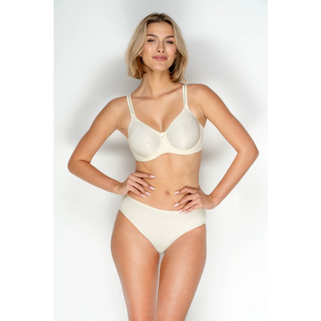 Bezešvá podprsenka z velmi pevného materiálu, který ňadrům dodá dostatečnou oporu. Podprsenka má vyšší střed s drobnou mašličkou, zádíčka jsou z pevného přitom pružného materiálu české výroby, který je velmi odolný proti vytažení.