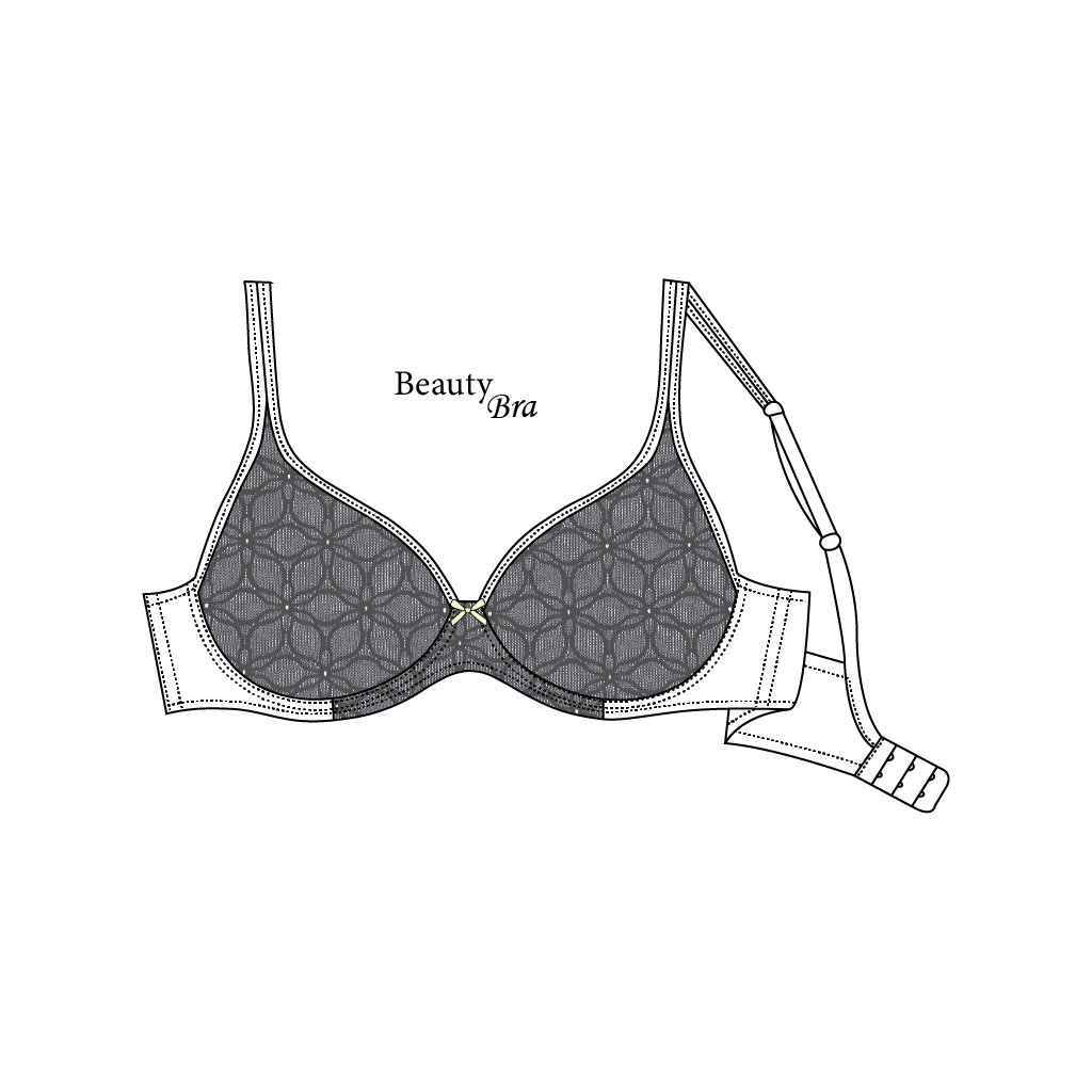 Slabě vyztužená podprsenka BeautyBra v kolekci First Class má nízký střed vhodný pro hluboký dekolt i do větších velikostí. Něžné květy na tylu v tělové a černé barvě. Černý tyl je podložený tělovým košíčkem, který vytváří elegantní nahý efekt.