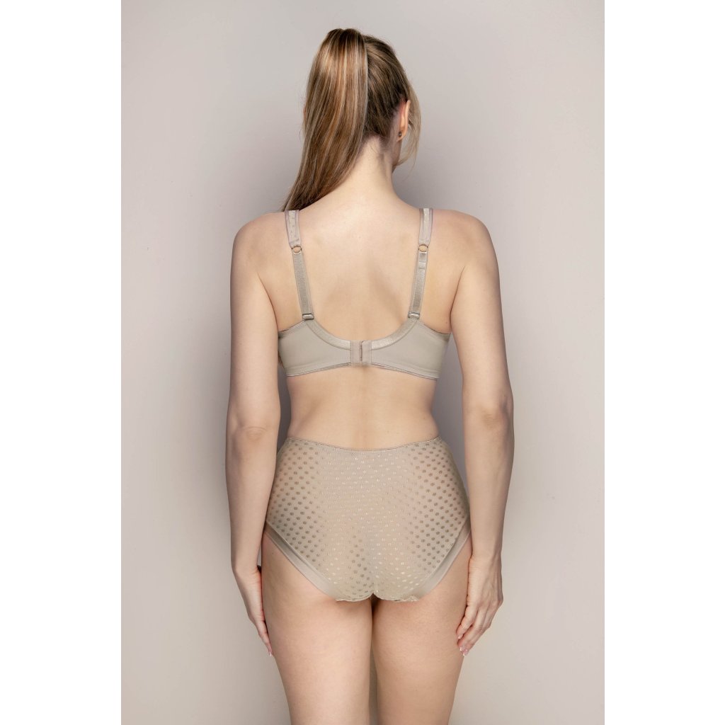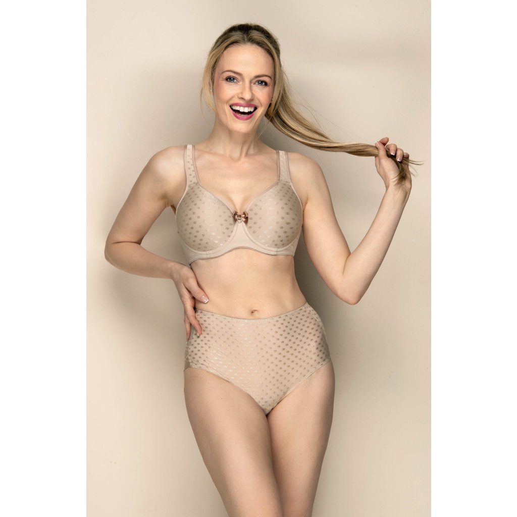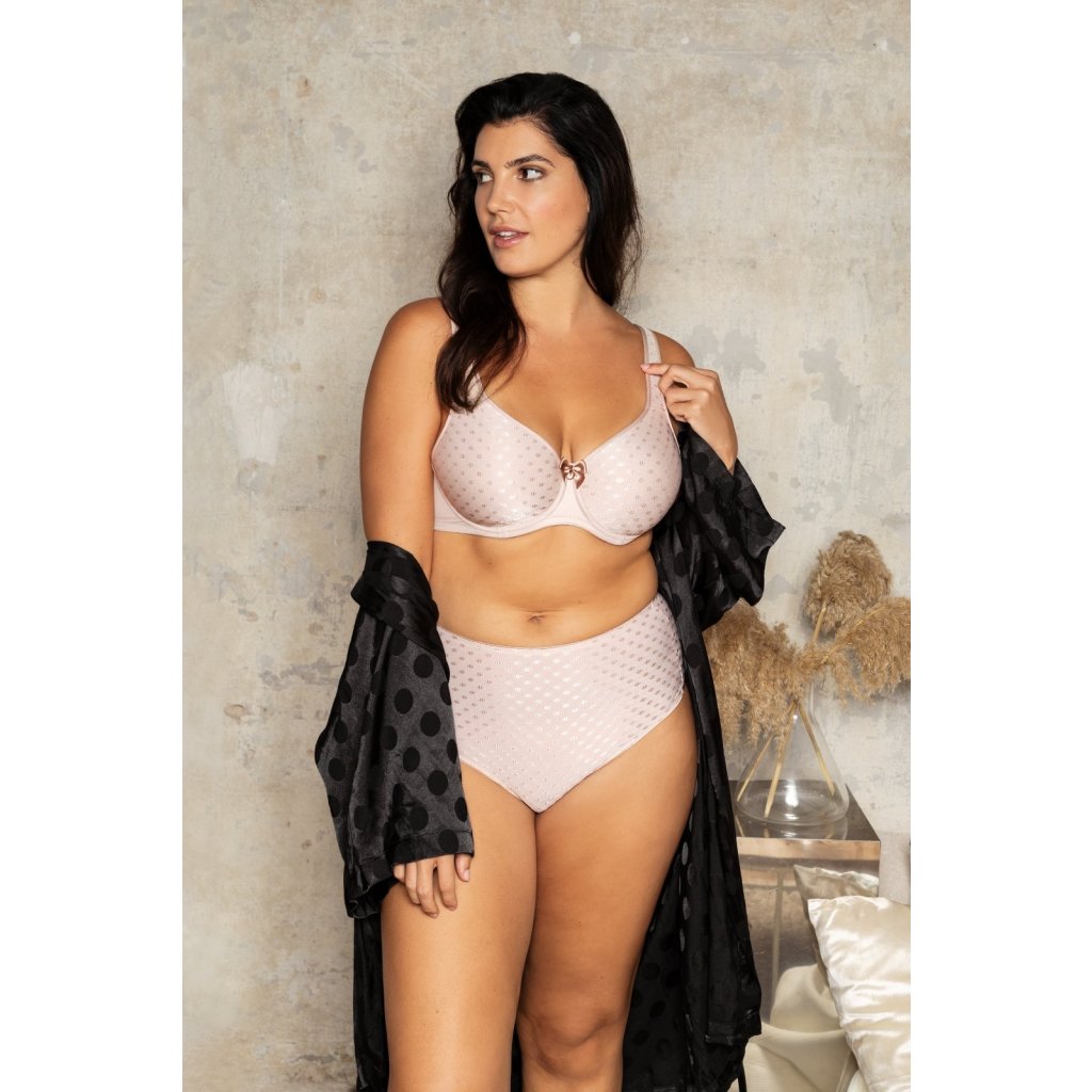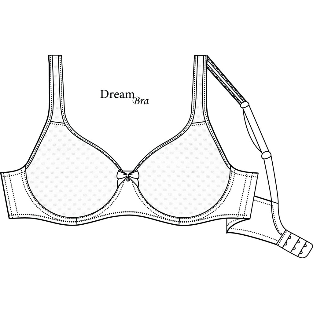 V kolekci Gingerbread s jemným stejnobarevných puntíků nemůže chybět naše nejprodávanější podprsenka ve střihu DreamBra. Tento střih je ideální především pro větší prsa. Díky lehké výztuži poprsí nezvětšuje, ale dodá jim pevný kulatý tvar. Širší ramínka se nezařezávají ani po celodenním nošení, vysoký střed drží prsa na místě. Po obvodu je podprsenka pevná, ale pružná.