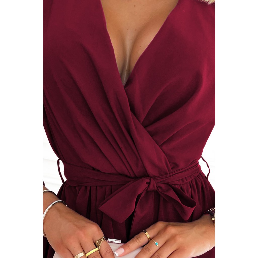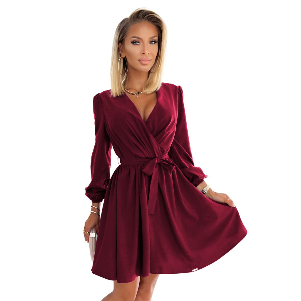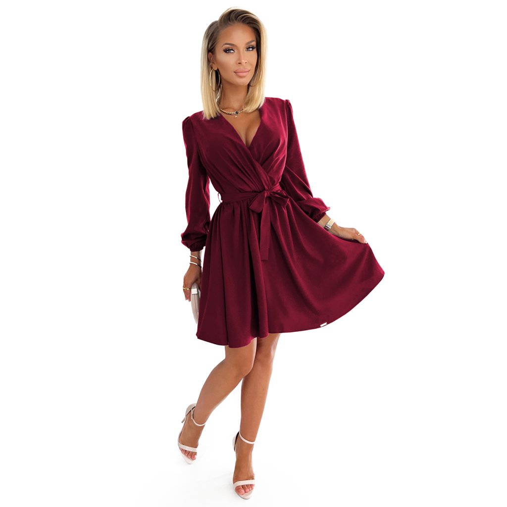 Bindy - dámské šaty s psaníčkovým výstřihem, zavazováním v pase a gumičkami na rukávech. Vínová barva. Polská výroba. Značka Numoco.