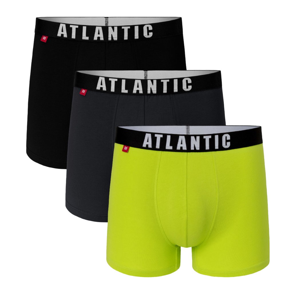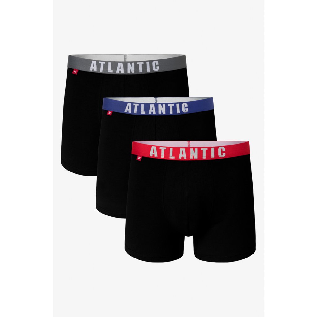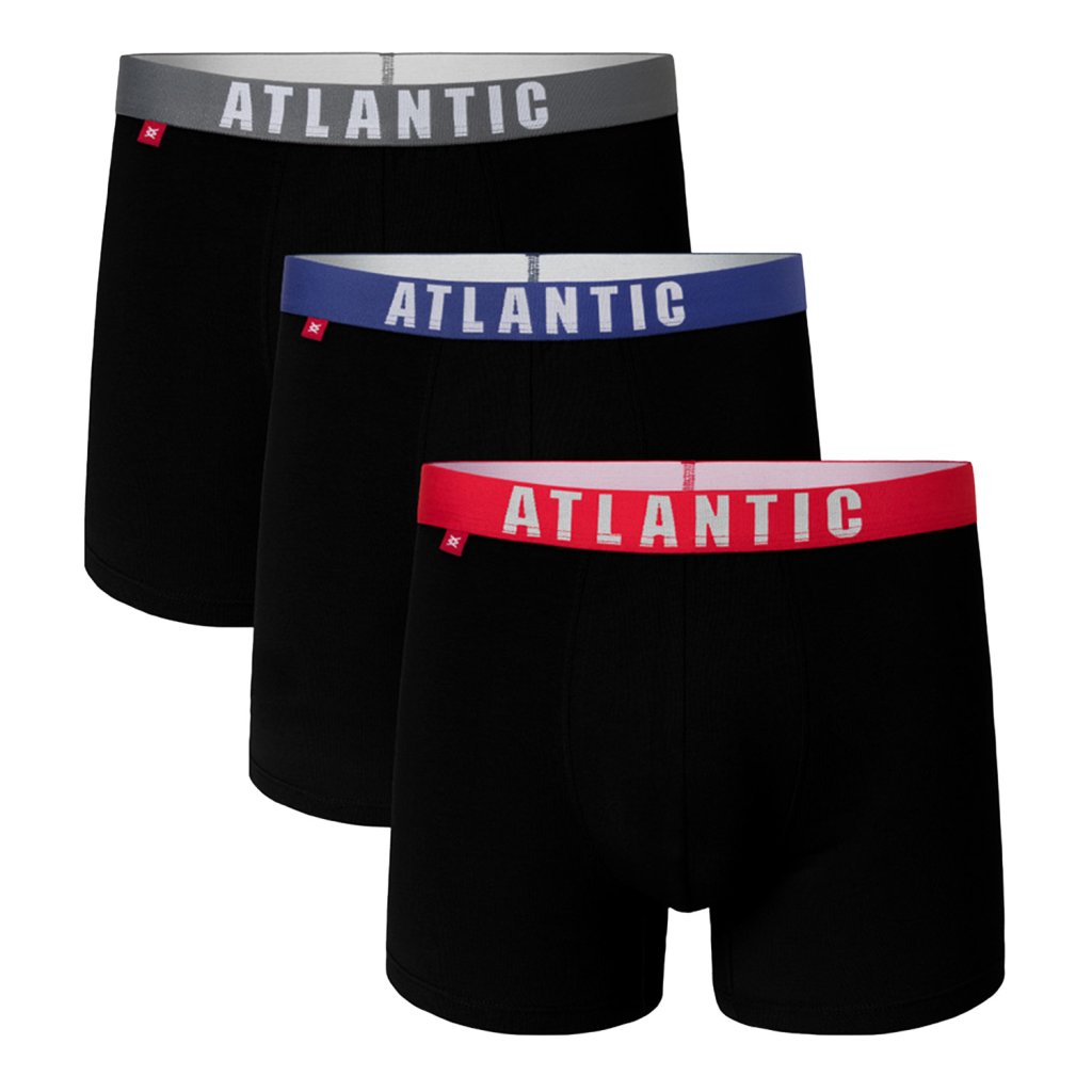 V trojbalení najdete černé pánské boxerky, které se liší barvou elastického pasu - šedou, modrou a červenou. Boxerky mají sportovní charakter s nízkým pasem a standardní délkou nohavic. V pase jsou kalhotky zakončeny měkkou a netlačící vnější gumou s velkým nápisem ATLANTIC.Složení: 95% bavlna, 5% elastan