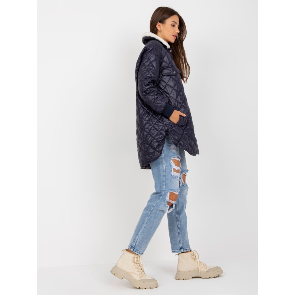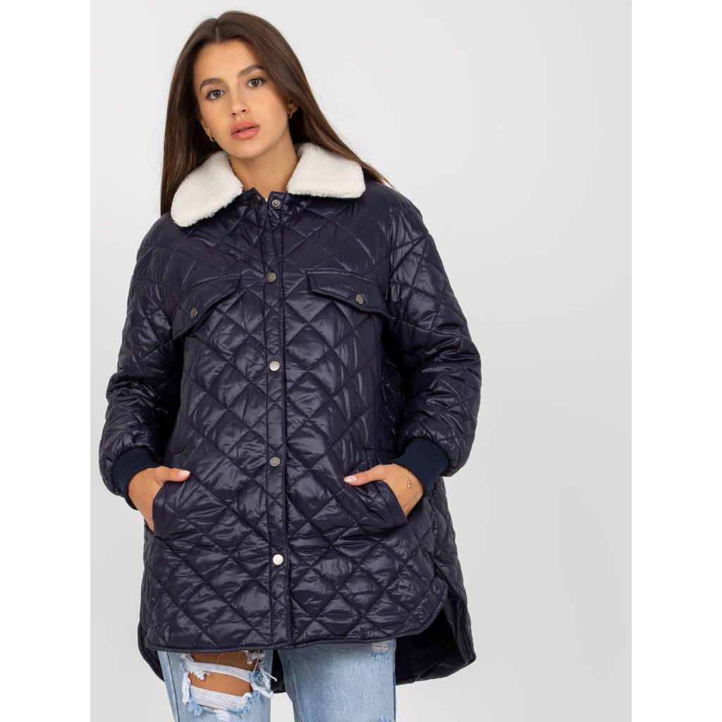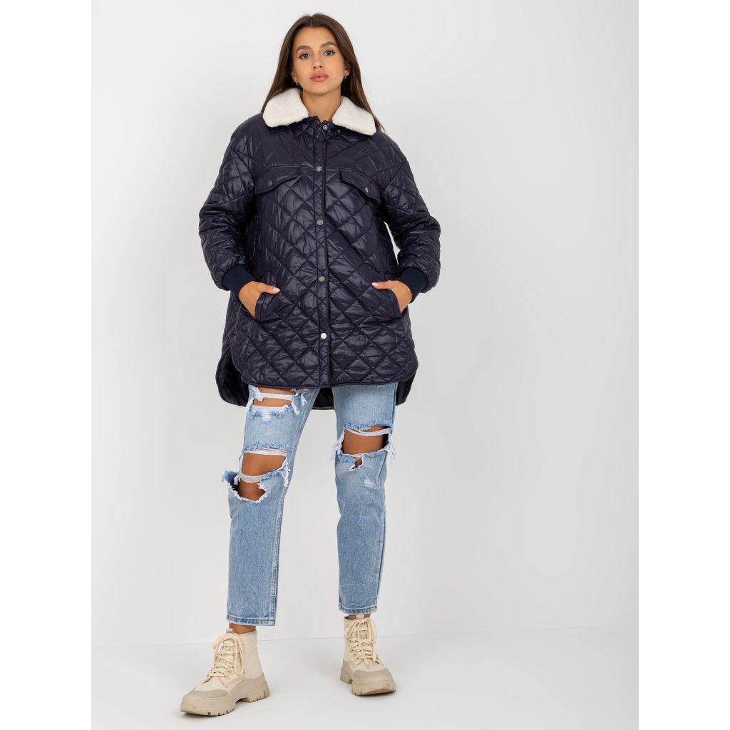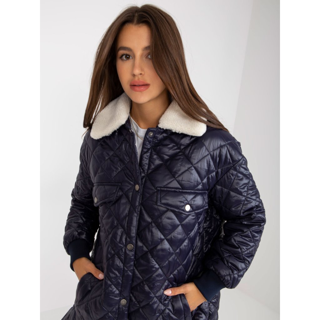 Tmavě modrá prošívaná bunda s kožešinovým lemem.
