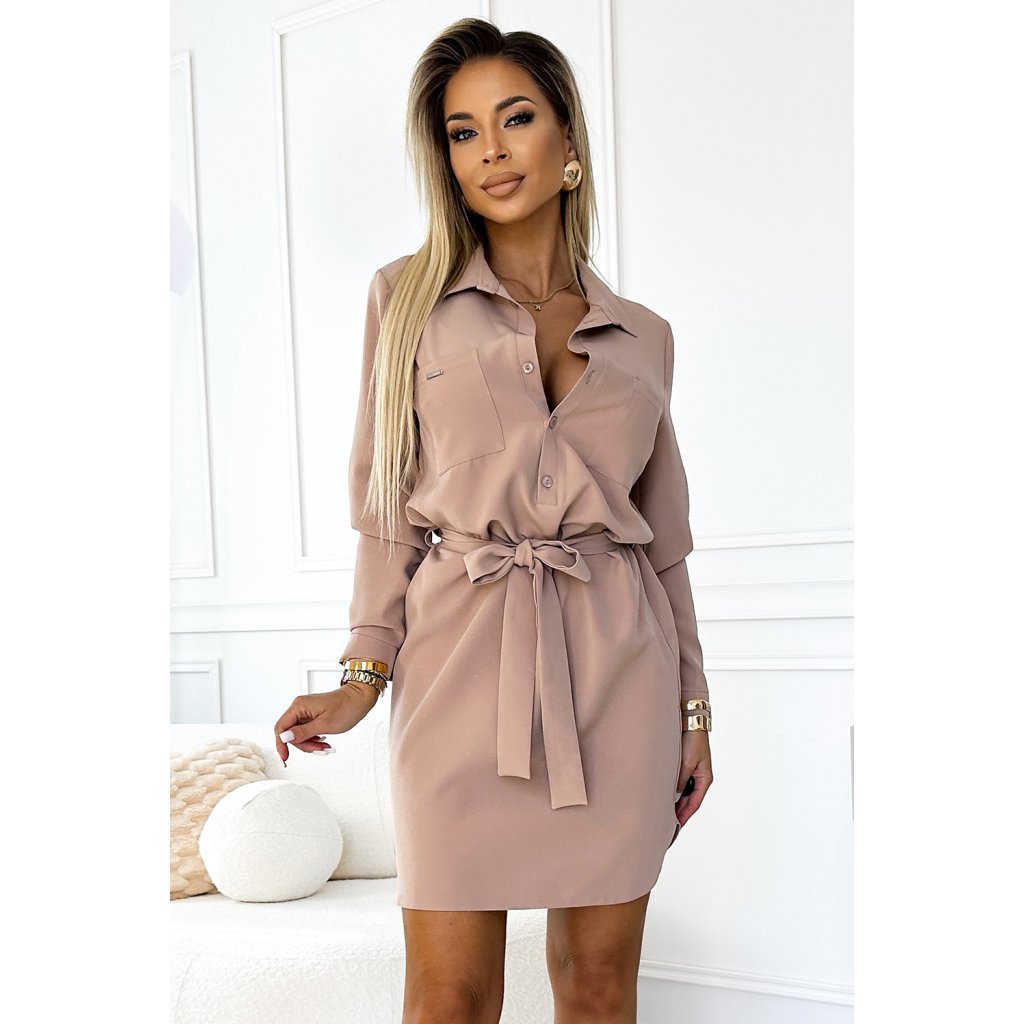 Camille - Košilové šaty s kapsami a zavazováním - béžové. Polský výrobek. Značka numoco.