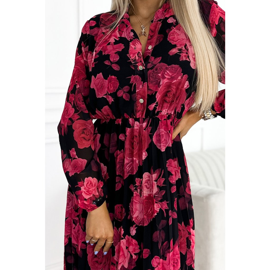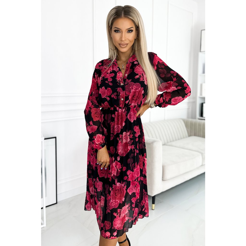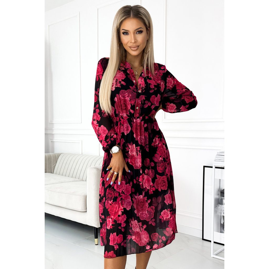 CARLA - šifonové řasené midi šaty na knoflíky a dlouhý rukáv. Provedení: černá s červenými růžemi. Značka Numoco. evropská produkce.