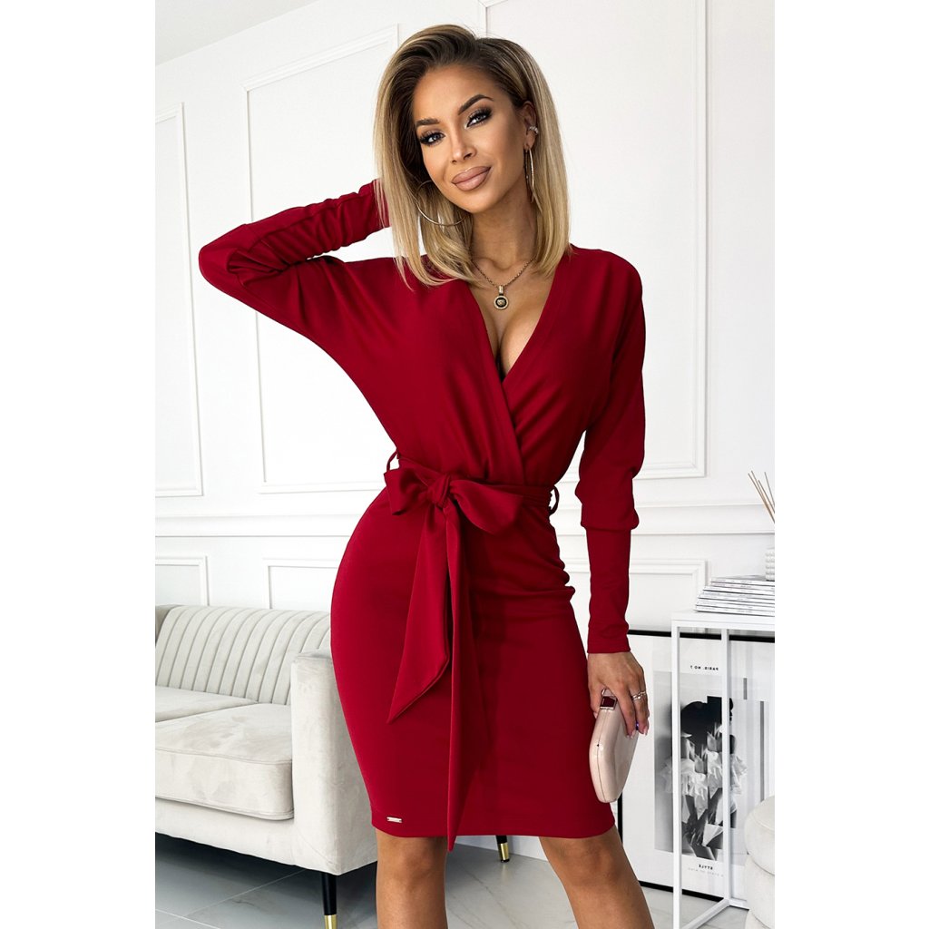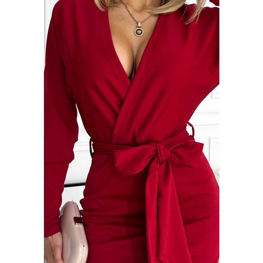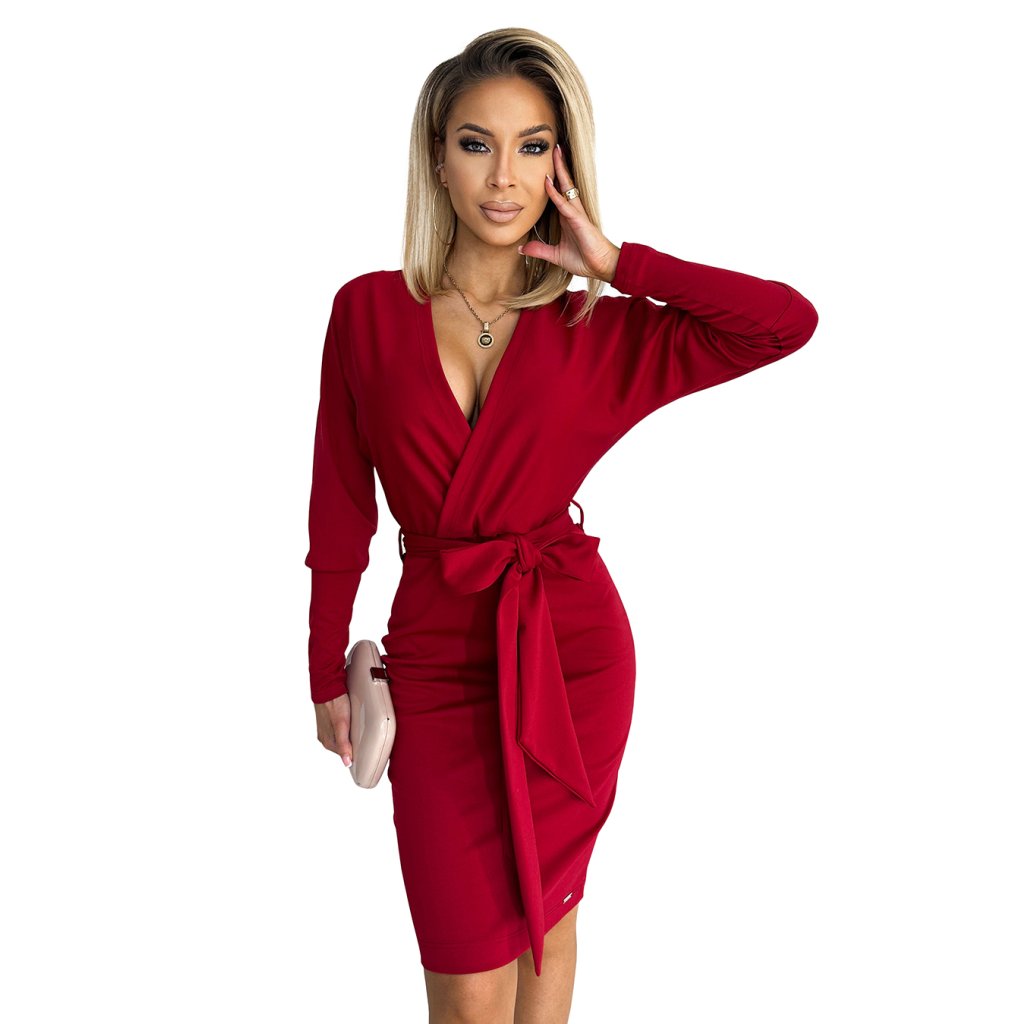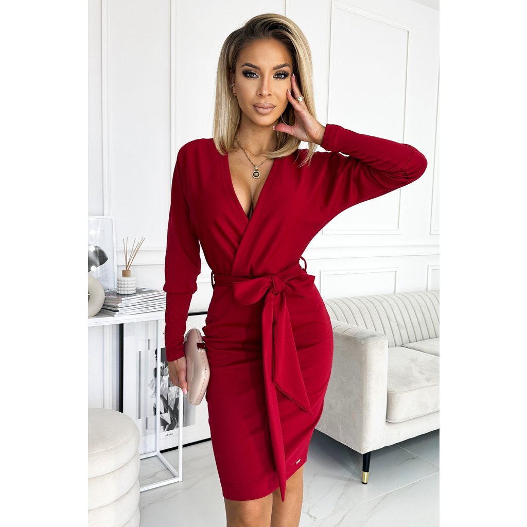 Celia - Obálkové šaty s výstřihem na zádech, dlouhým rukávem a zavazováním v pase. Vyrobeno z příjemného na dotek, silnějšího materiálu. Vínová barva. Značka Numoco. Polská výroba.
