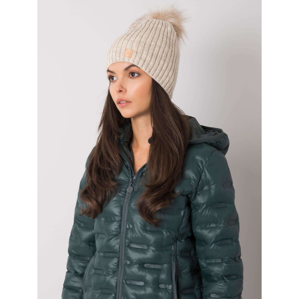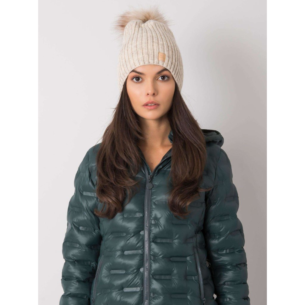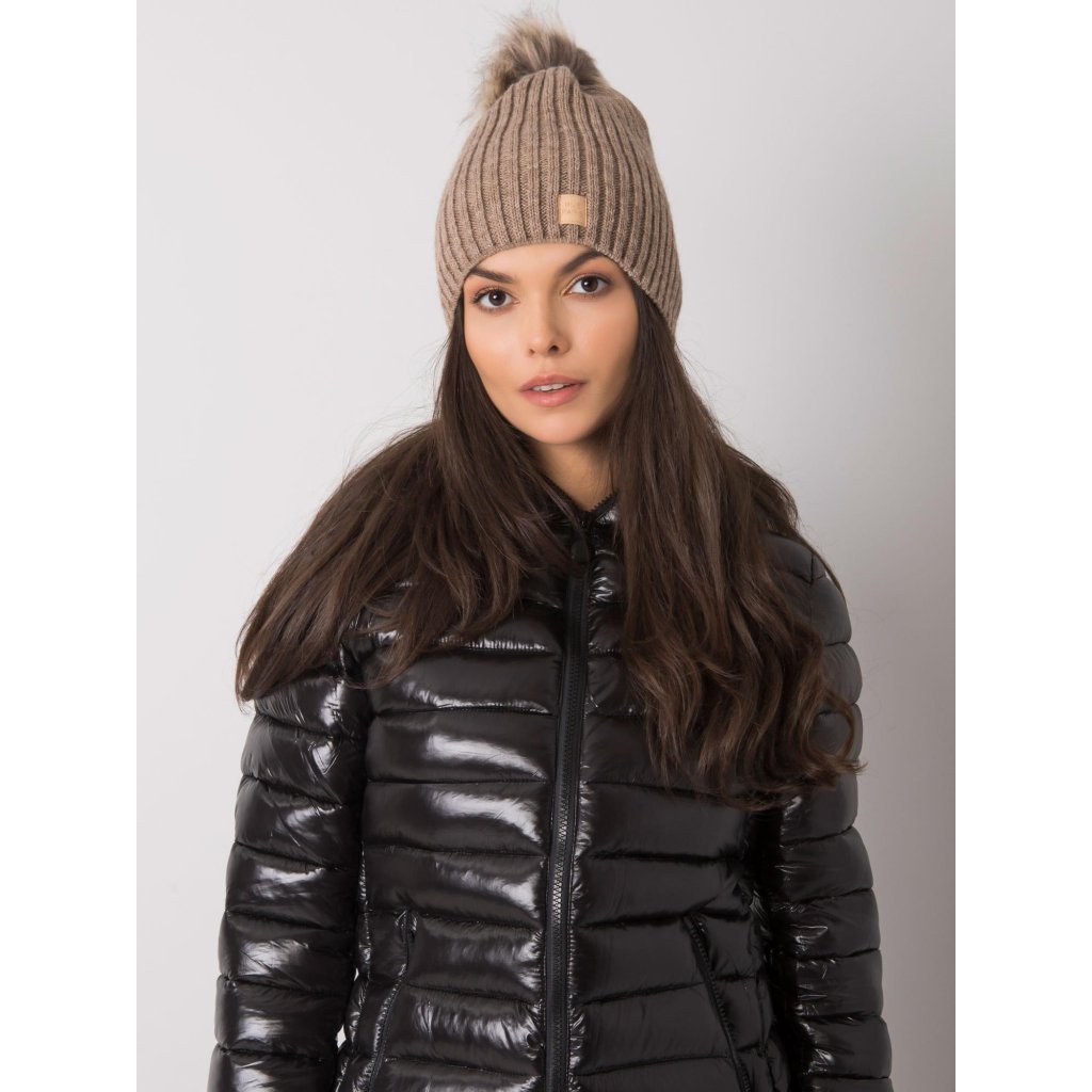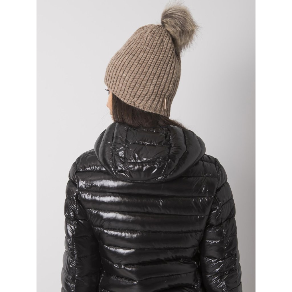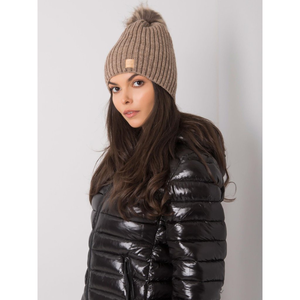 Tmavě béžová čepice s bambulkou.