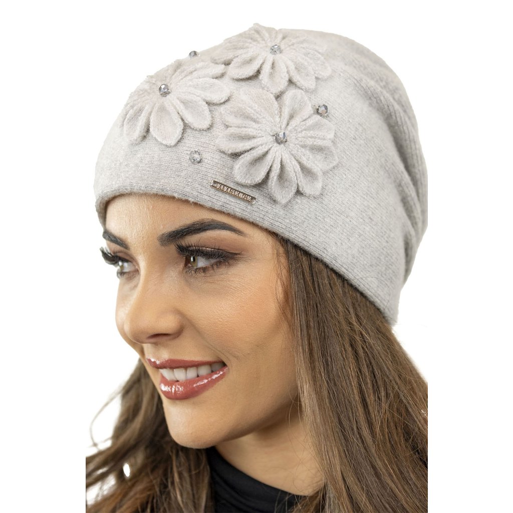 Módní dámská čepice- přední strana zdobená květinovou aplikací