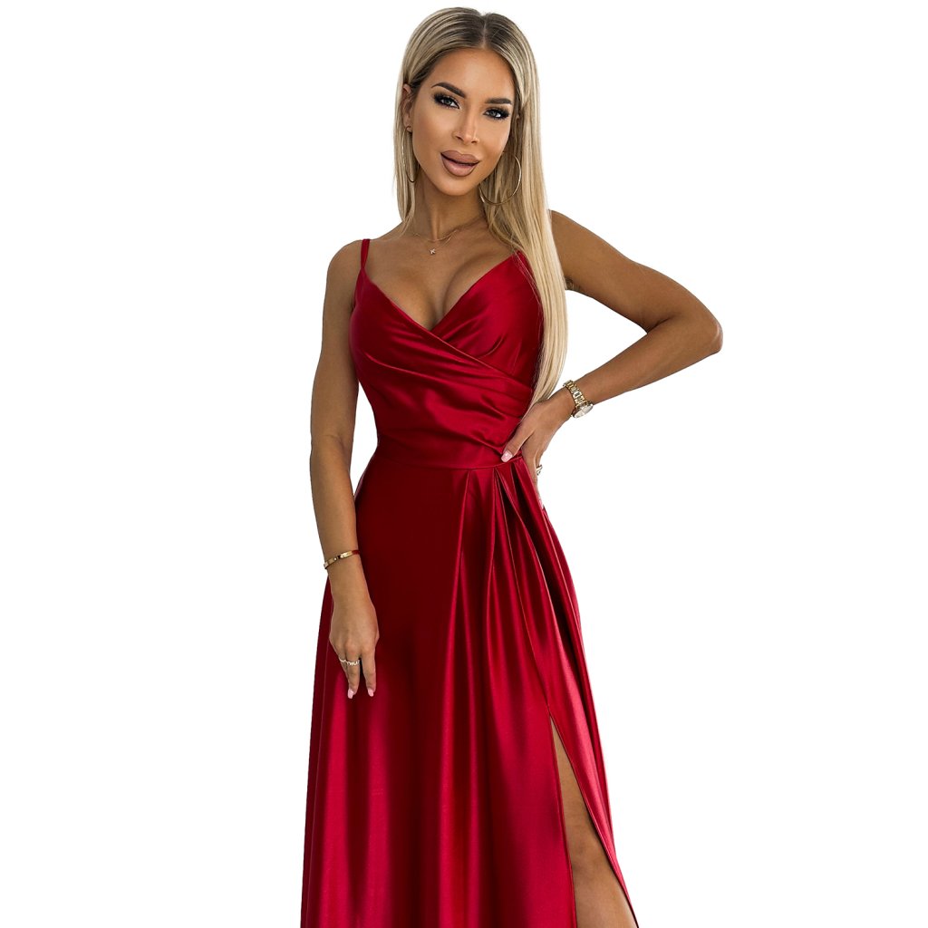 Chiara - elegantní saténové maxi šaty na ramínka. Krásně tvarovaný výstřih a střih na sukni vytvářejí neobvyklou kompozici. Z lesklého, hladkého, lehce elastického saténu v Červené barvě. Šaty jsou ideální na svatby, Silvestra, ples, karneval a další významnější události. Polská výroba. Značka Numoco.