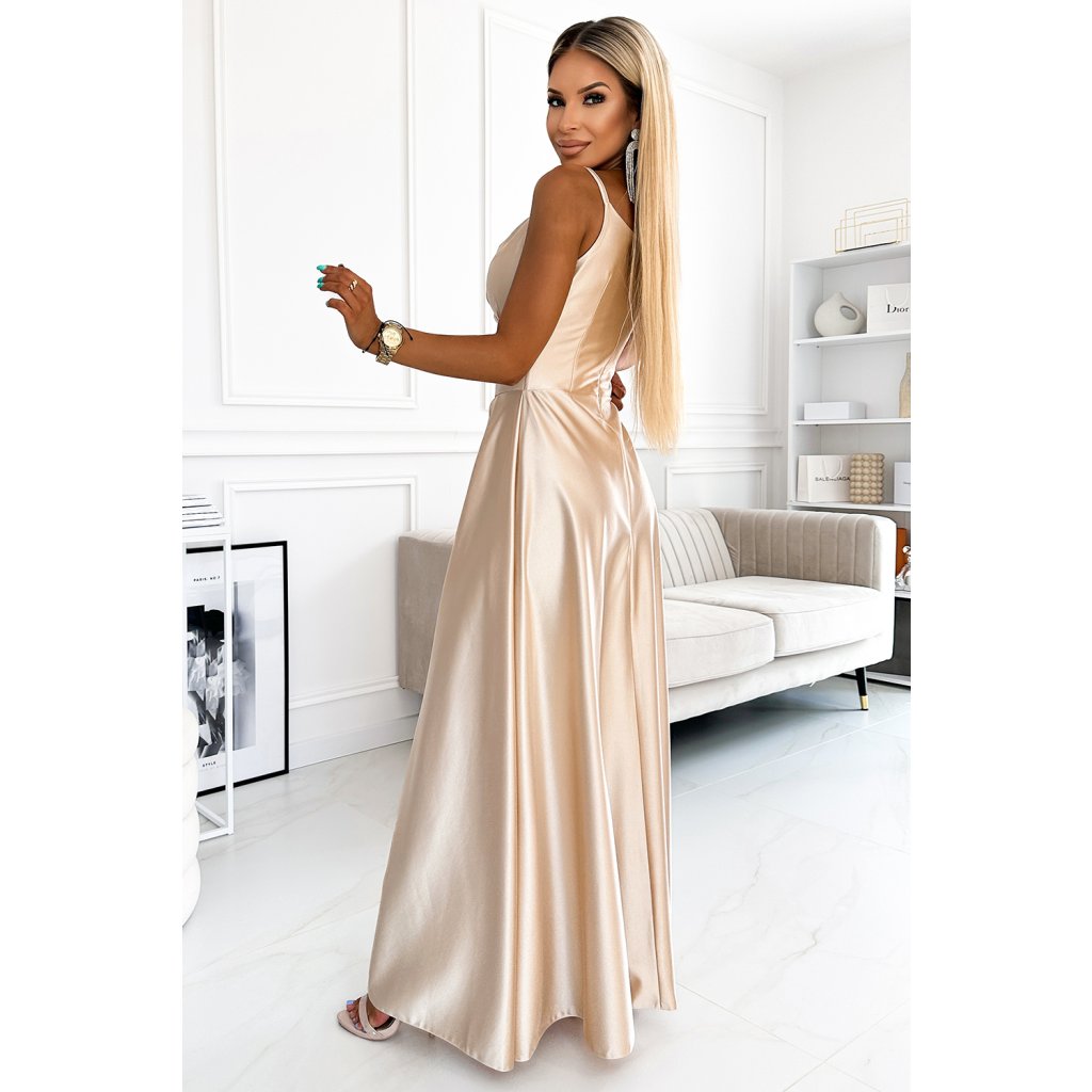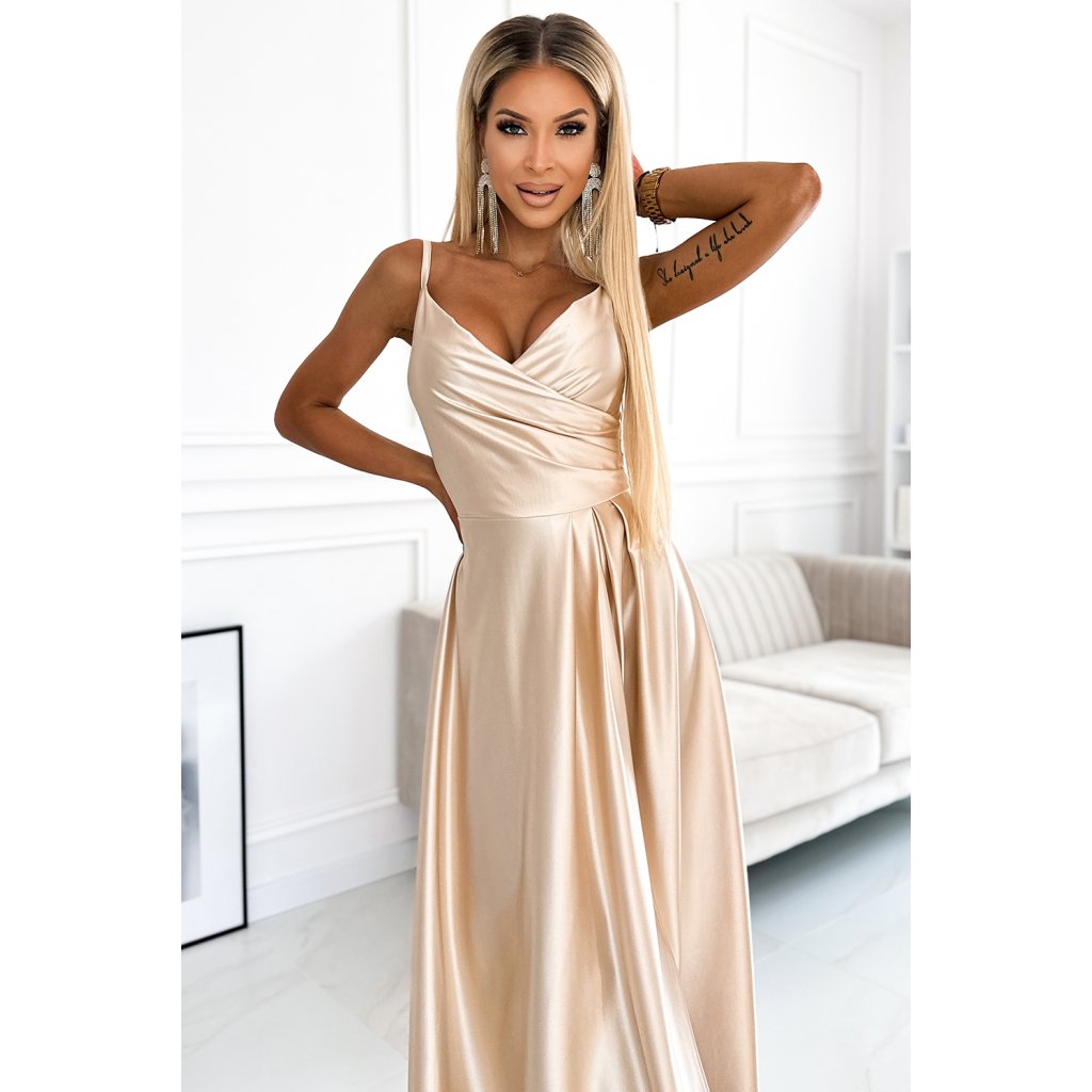 Chiara - elegantní saténové maxi šaty na ramínka. Krásně tvarovaný výstřih a rozparek na sukni vytvářejí nevšední kompozici - zlatá barva. Polská výroba. Značka Numoco.