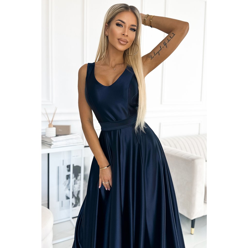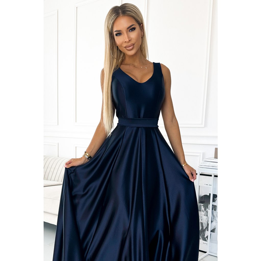 ČernáCindy - dlouhé saténové maxi šaty s výstřihem a mašlí. Vyrobeno z na dotek příjemného lesklého materiálu v módní tmavě modré barvě. Zapínání vzadu na krytý zip. Polský výrobek. Značka numoco.