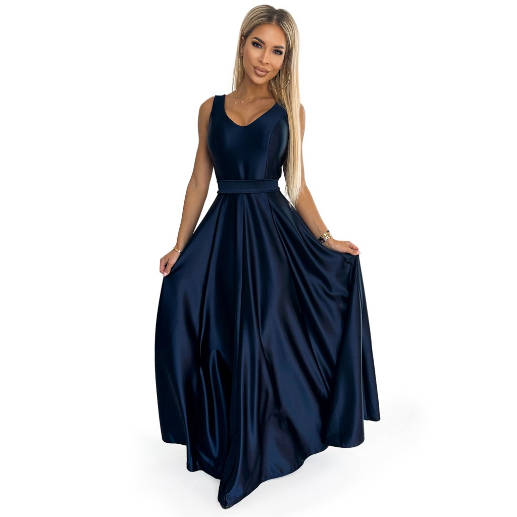 CINDY dlouhé saténové šaty s výstřihem a mašlí - tmavě modré 508-1