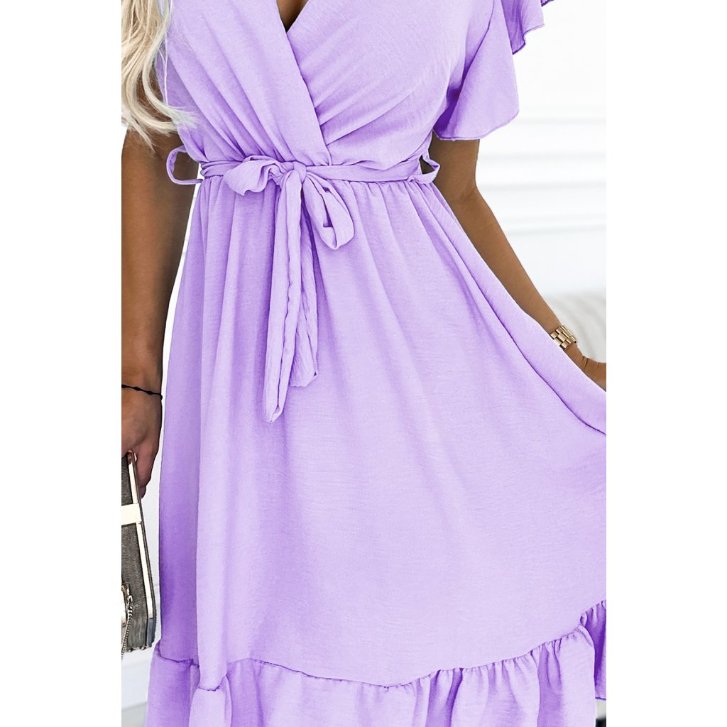 CORNELIA - šaty s psaníčkovým výstřihem, volány a zavazováním v pase. Barva: vřes. Značka Numoco. Evropská produkce.