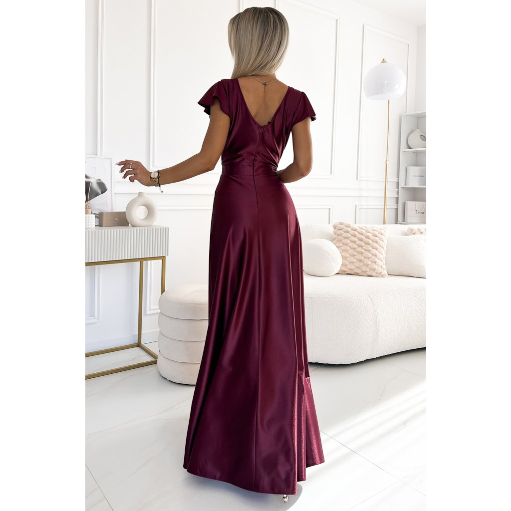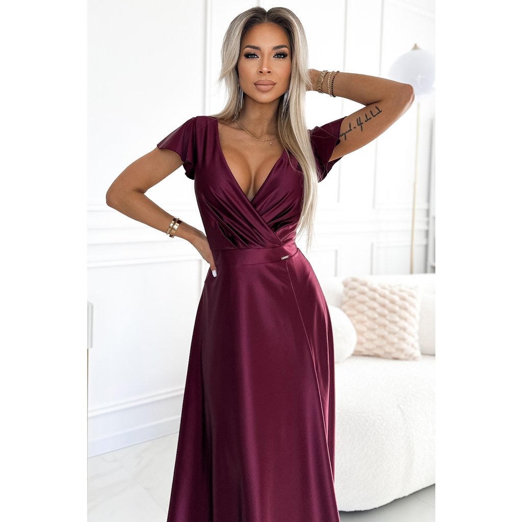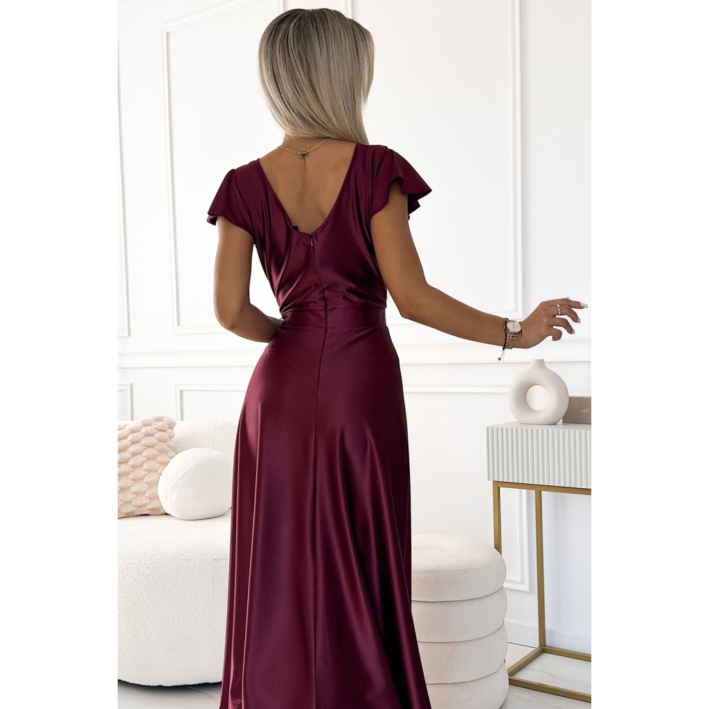 CRYSTAL saténové dlouhé šaty s výstřihem - Vínová barva 411-10