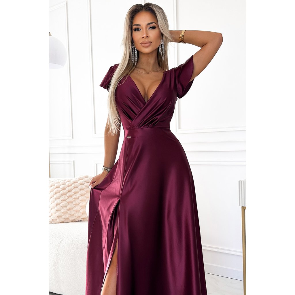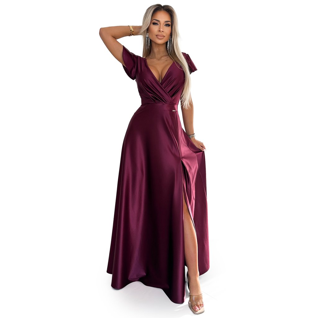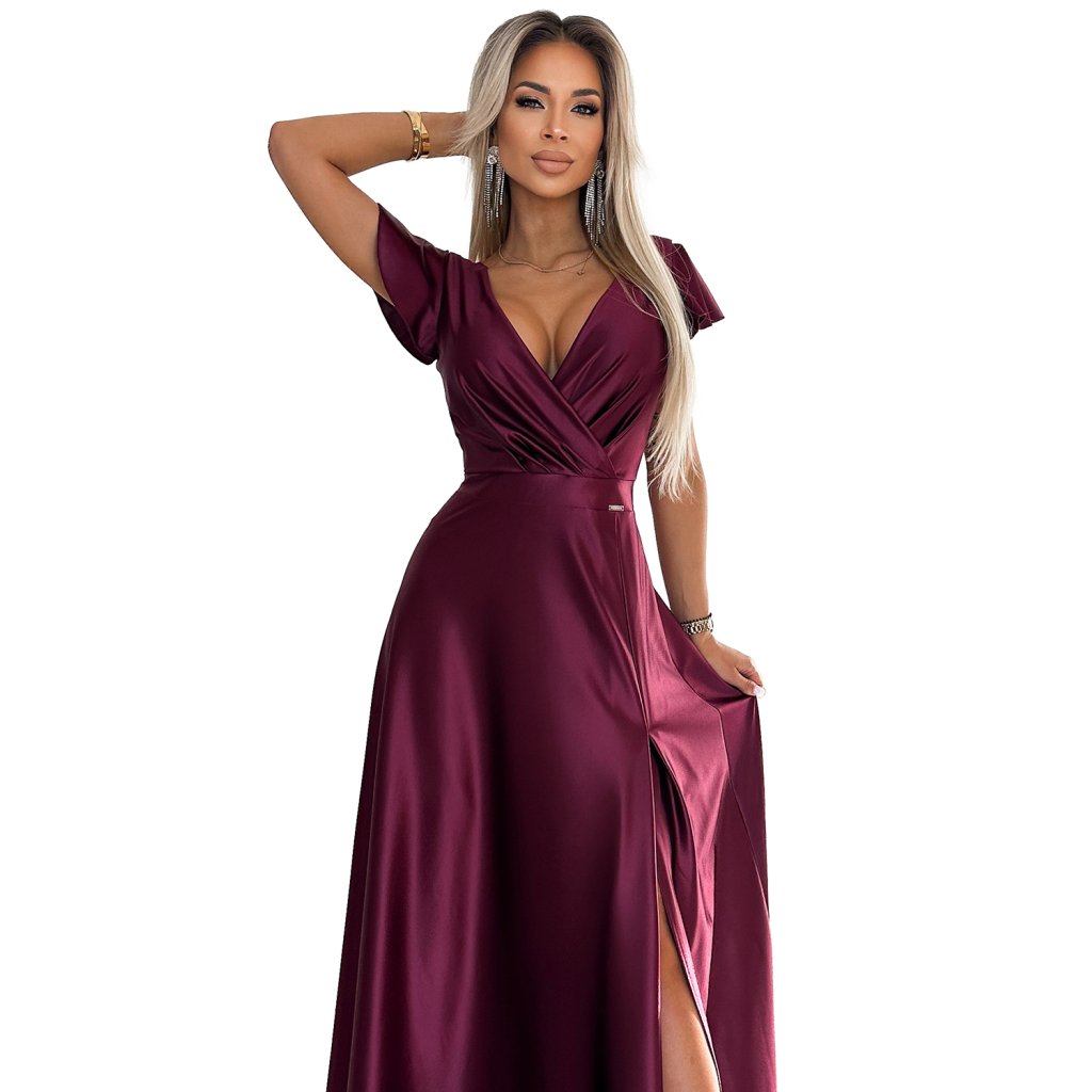 CRYSTAL - dlouhé saténové maxi šaty s psaníčkovým výstřihem a rozparkem na nohavici. Vínová barva. Šaty krásně odhalují dekolt a vypadají skvěle při tanci. Zapínání vzadu na krytý zip. Polský výrobek. Značka numoco.