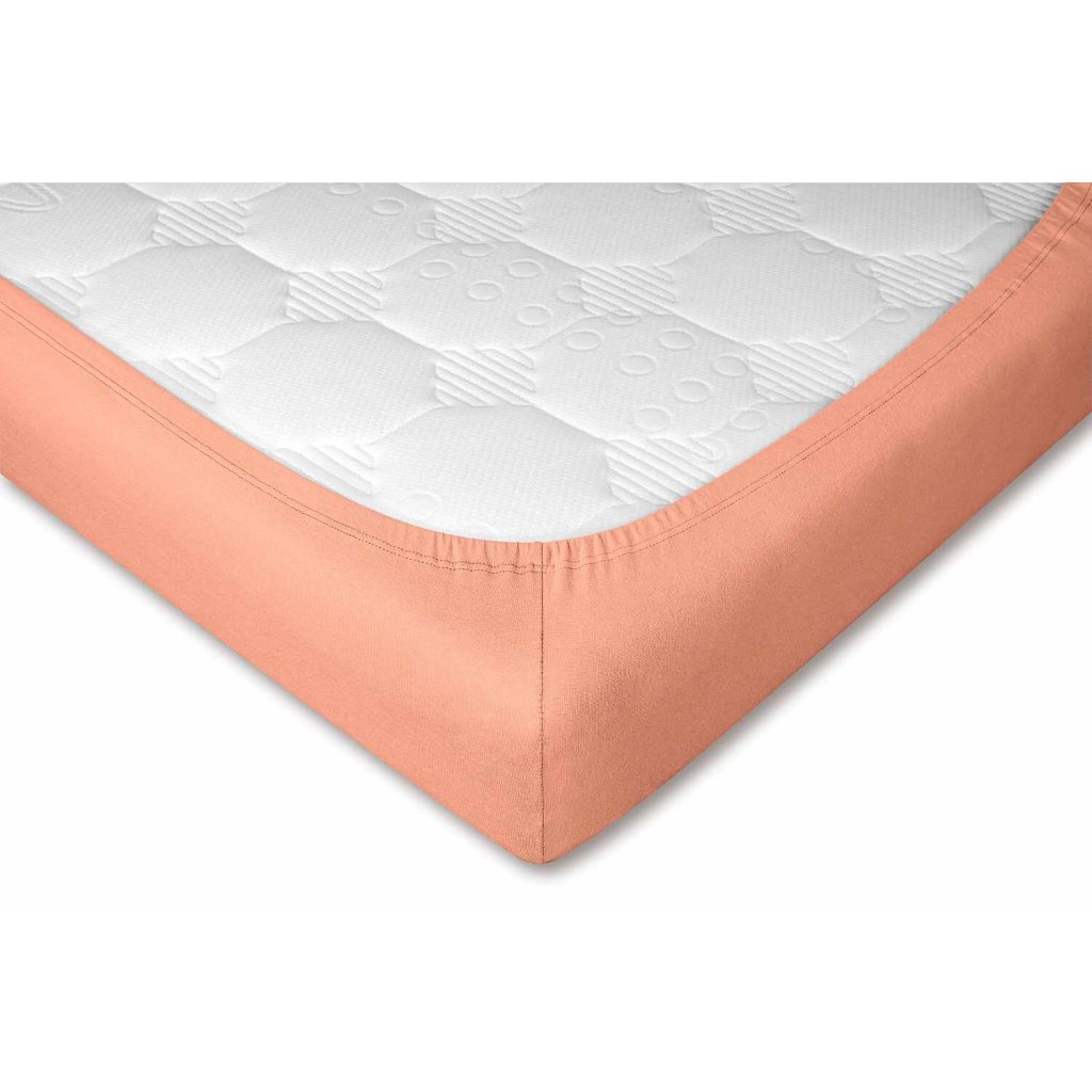 Napínací jersey prostěradlo v meruňkové barvě je ušito z kvalitní směsi 95 % česané bavlny a 5 % elastanu. Tato kombinace zajišťuje vysokou pružnost, rozměrovou stálost a dokonalé přilnutí k matraci. Hladký jersey materiál je příjemný na dotek a ideální pro celoroční použití.