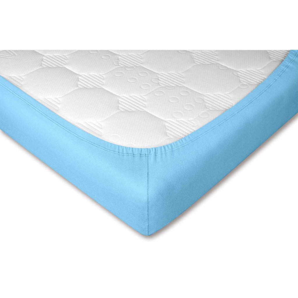 Světle modré jersey prostěradlo působí klidně a svěže. Skvěle se kombinuje s bílým, tmavě modrým nebo šedým povlečením. Ideální volba do ložnice, dětského pokoje i penzionu.