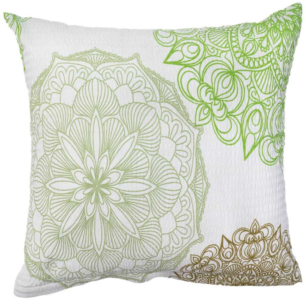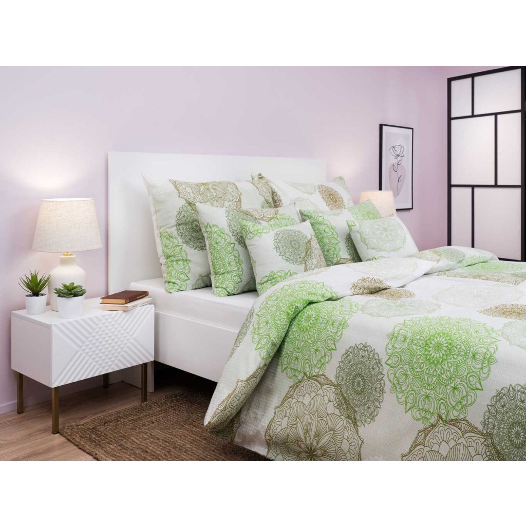Stylový povlak na polštář Magic světle zelená přináší do vaší ložnice svěží a harmonický vzhled. Bílý podklad zdobí jemné mandalové ornamenty ve světle zelených, zelených a hnědých tónech, které dodávají interiéru elegantní a moderní atmosféru.