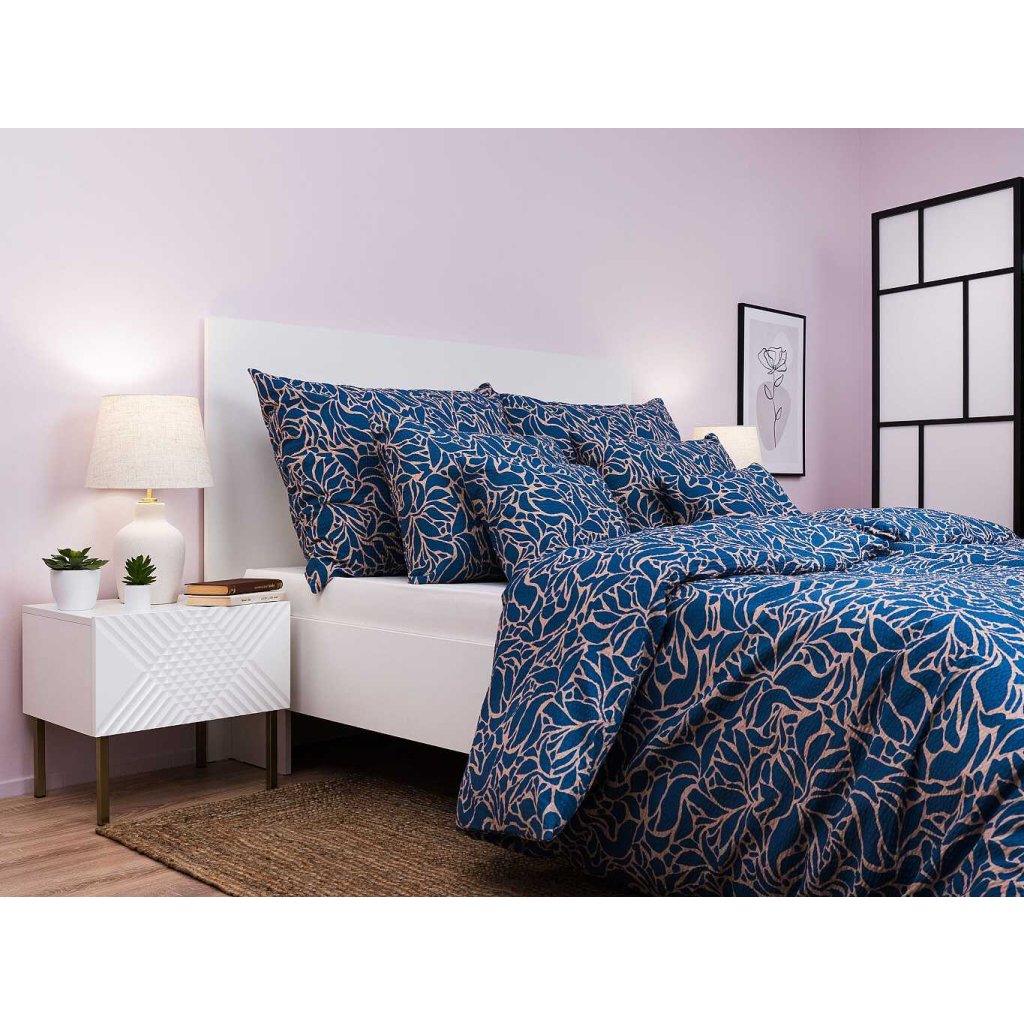 Elegantní povlak na polštář Sorat tmavě modrý zaujme svým výrazným a moderním vzhledem. Abstraktní motiv v tmavě modré barvě na světlém podkladu působí stylově – ideální pro moderní, přírodní i městské interiéry.