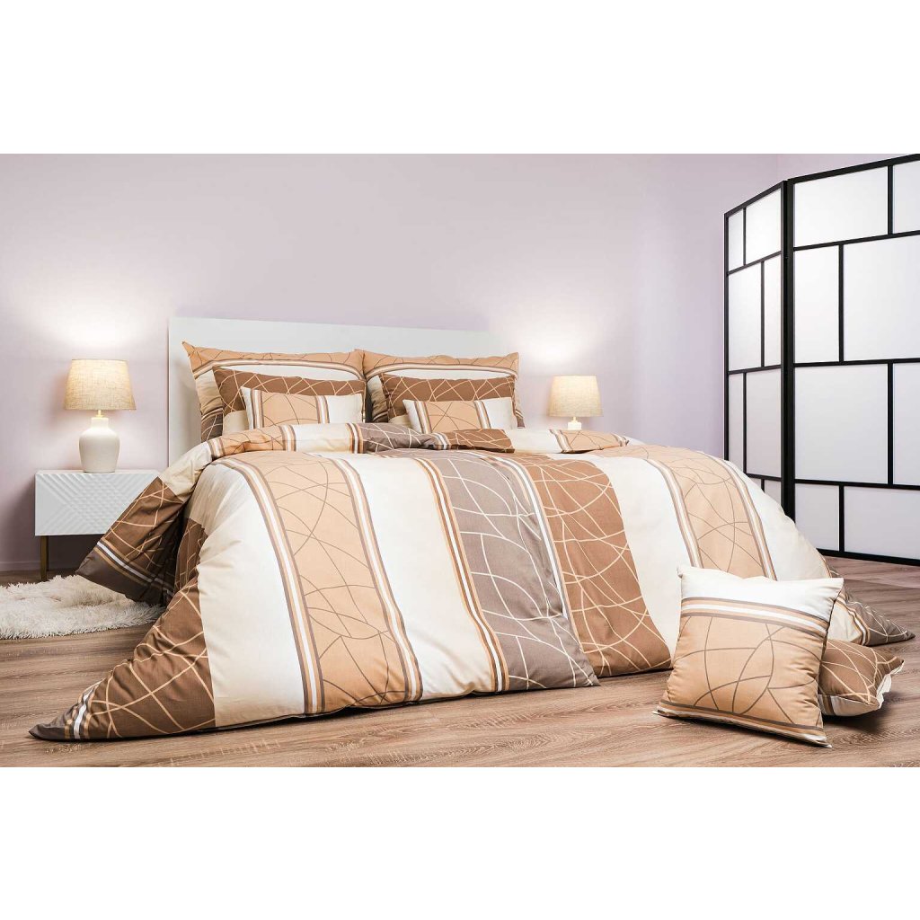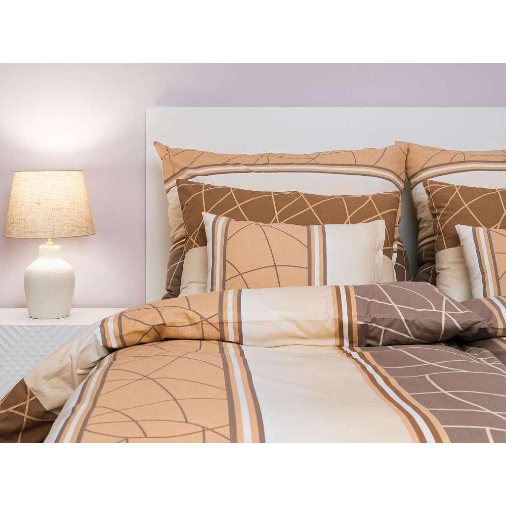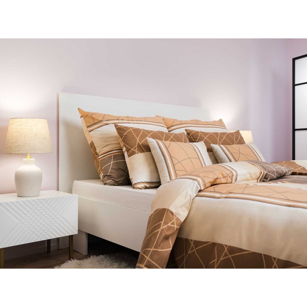 Moderní ložní prádlo s geometrickým vzorem Bruno opál v odstínech béžové a bílé přináší do ložnice decentní eleganci a klid. Vzor tvoří jemné linie a pruhy, které působí harmonicky a nadčasově. Povlečení doporučujeme kombinovat s prostěradly v barvě opálová, medová, banánová nebo bílá. Vyrobeno v České republice firmou DADKA VRACOV.