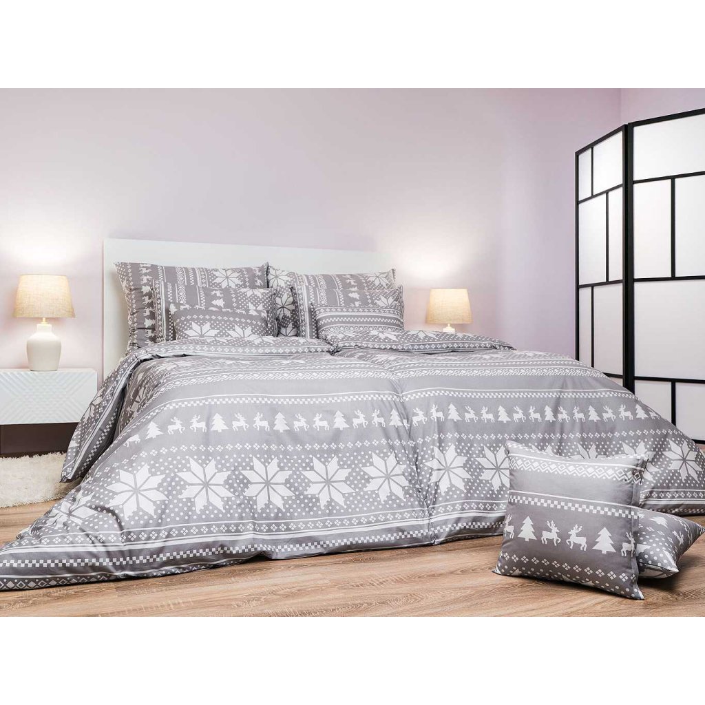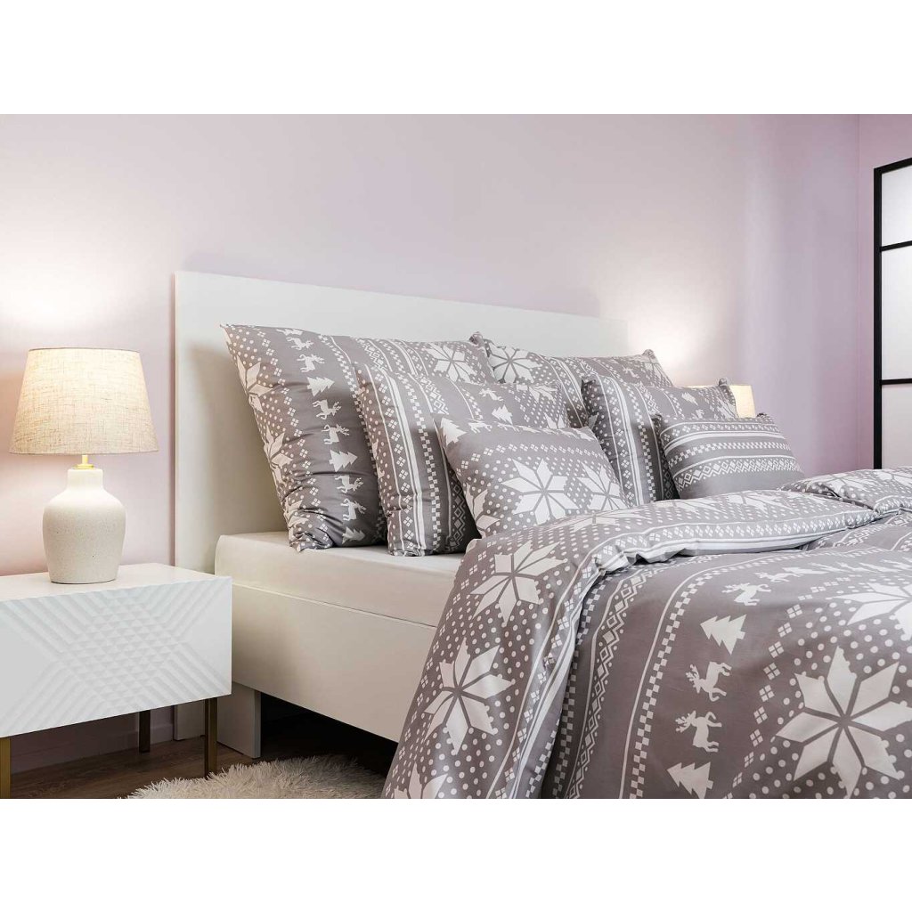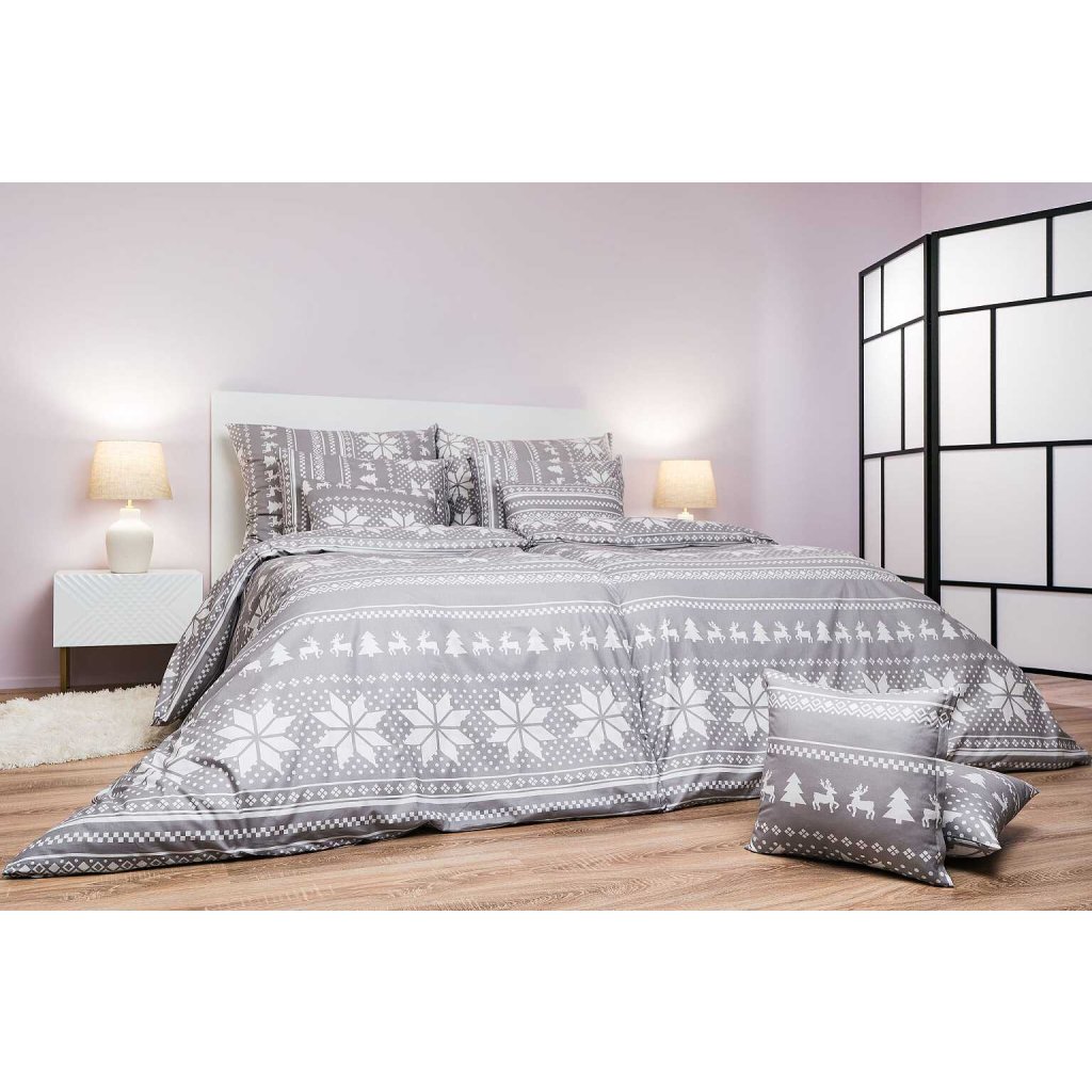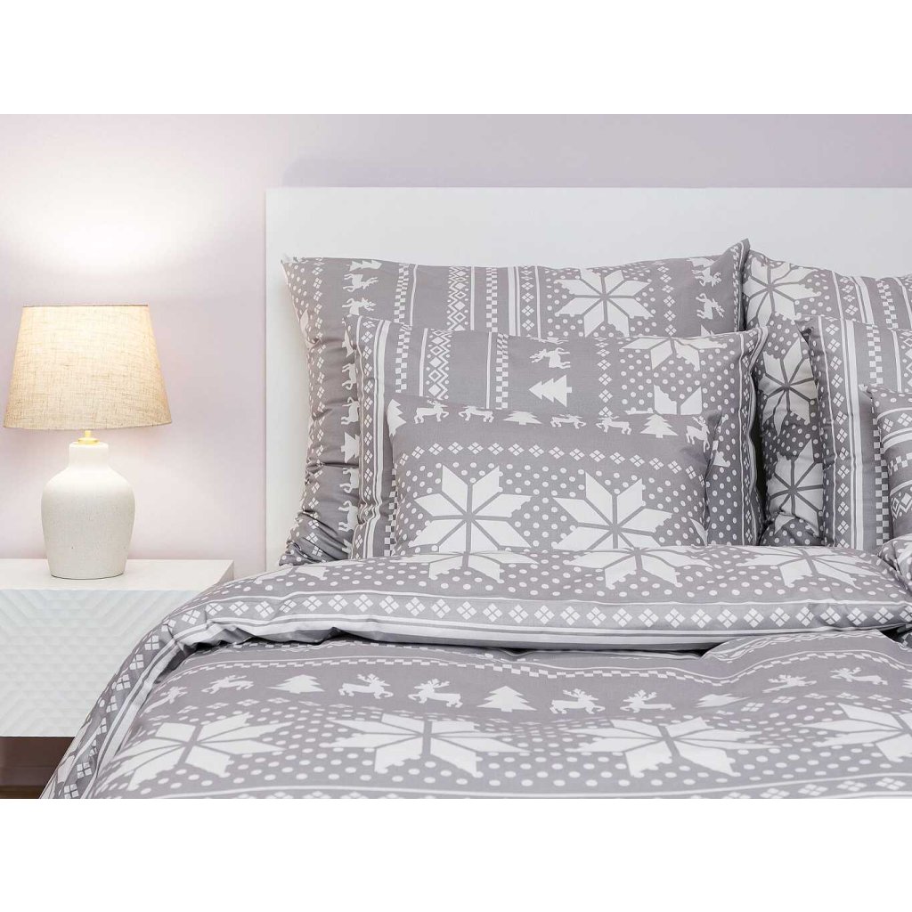 Stylové ložní prádlo Sobi šedí s motivem sněhových vloček, sobů a stromků v bílé barvě na šedém podkladu přináší do ložnice útulnou zimní atmosféru. Doporučujeme kombinovat s prostěradly v barvě bílá nebo šedá. Vyrobeno v České republice firmou DADKA VRACOV.