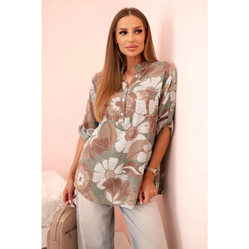 Tato dámská halenka je kombinací pohodlí a stylu, který se hodí skvěle na každý den. Je vyrobená z přírodní, prodyšné bavlny, která zajišťuje pohodlí i v teplejších dnech. Rukáv 3/4, který lze vyhrnout a zapnout na knoflík, nabízí praktickou možnost nastavení a dodává halence lehkost a volný charakter. Volný střih s kapsou na prsou zdůrazňuje casual styl této halenky. Velký, výrazný květinový vzor dodává halence módní a nápaditý vzhled, takže se můžete cítit výjimečně a žensky. Velikost je univerzální a bude vhodná pro dámy ve velikosti S, M nebo L.