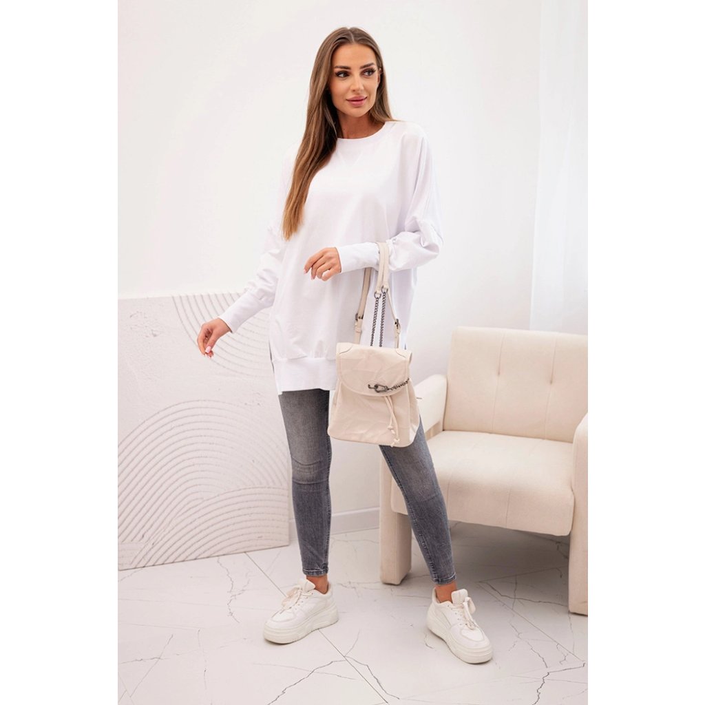Dámská mikina s dlouhým rukávem a širokým lemem na spodním okraji je pohodlnou a módní volbou pro každodenní stylizace. Vyrobena z vysoce kvalitního materiálu, 90% bavlny a 10% elastanu, zajišťuje pružnost a měkkost, což garantuje pohodlí po celý den. Oversize střih se širokým lemem a bočními rozparky dodává mikině volný a moderní vzhled. Ideální na chladnější dny, skvěle se hodí k legínám, džínům nebo sukni. Je to univerzální prvek garderoby, který spojuje pohodlí s módním stylem. Velikost je univerzální a bude vhodná pro dámy ve velikosti M, L, XL.
