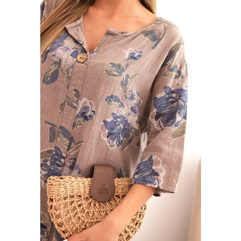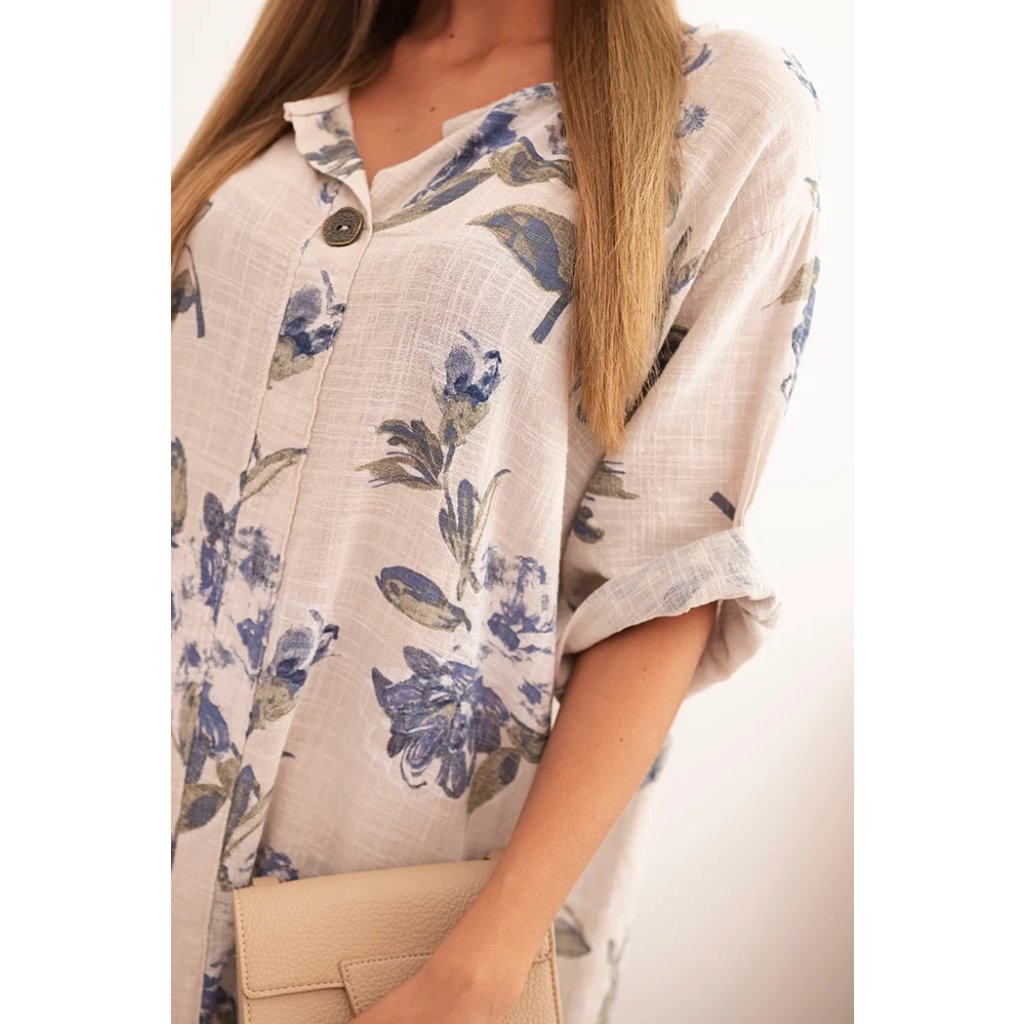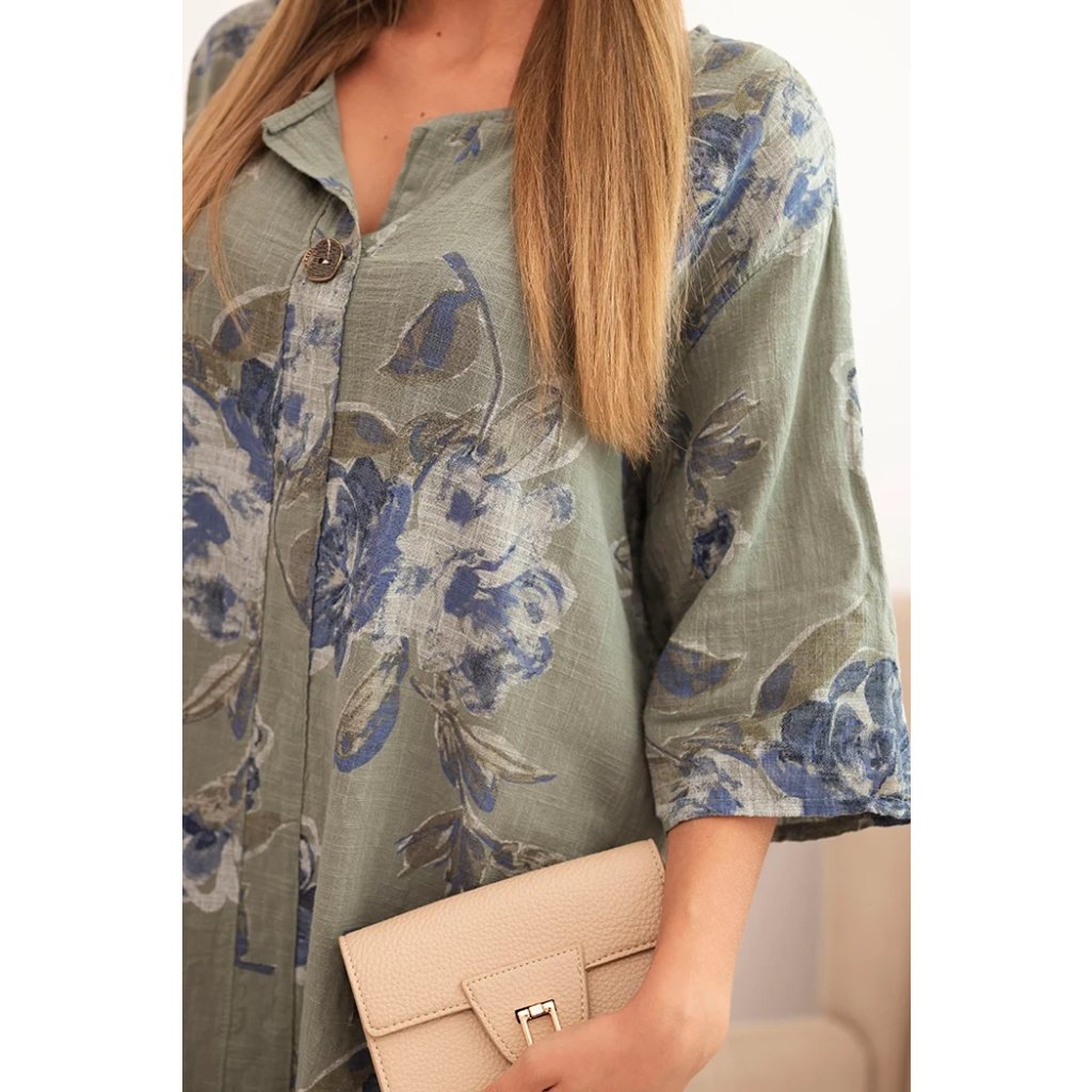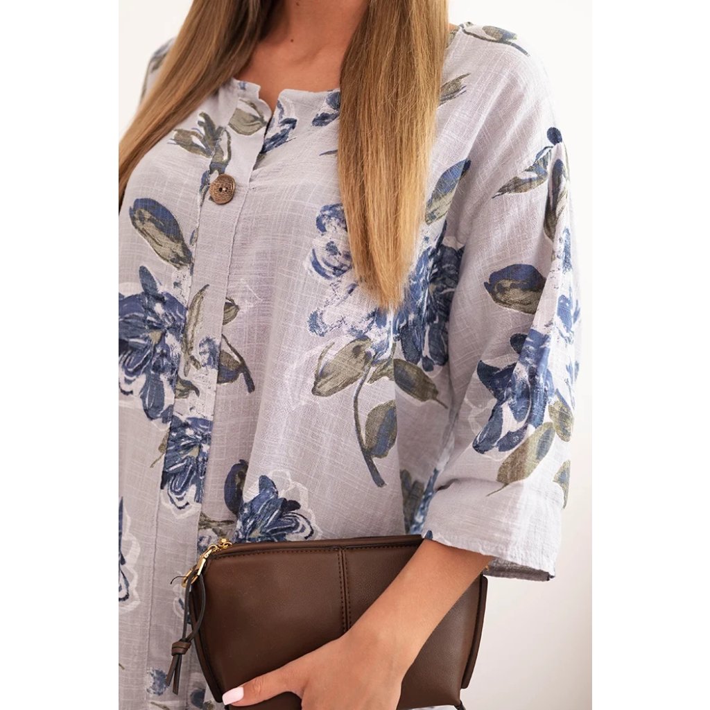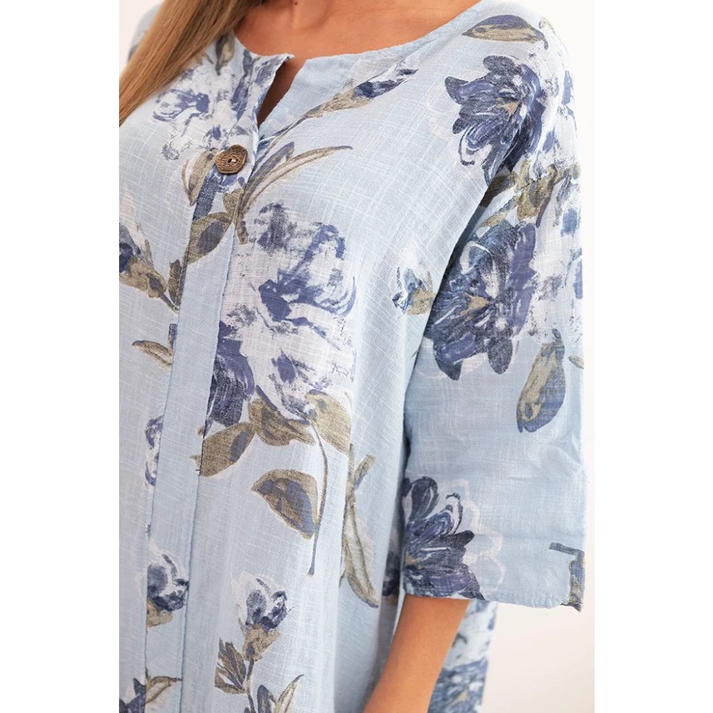 Hledáte pohodlné, lehké a ženské šaty na denní nošení? Tyto dámské šaty z příjemné bavlny jsou skvělou volbou na jaro a léto. Jemný květinový vzor a tlumená barevnost jí dodávají subtilní, přirozený charakter. Volný střih s lehce spadlým rukávem do lokte zajišťuje volnost pohybu a komfort nošení po celý den. Ideální na procházku, do práce i na setkání s přáteli. Výstřih s ozdobným knoflíkem a lehce asymetrický konec jí dodávají výjimečný půvab. Velikost je univerzální a bude vhodná pro dámy ve velikosti S, M nebo L.