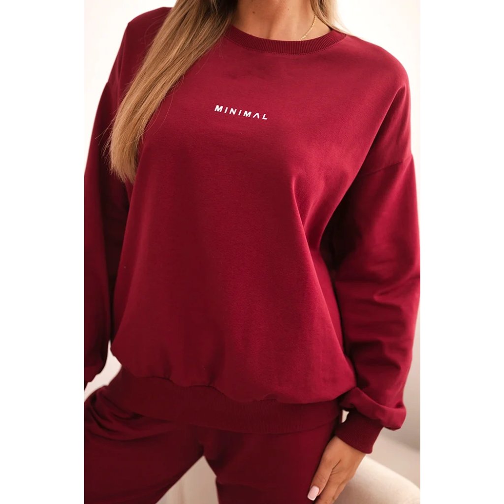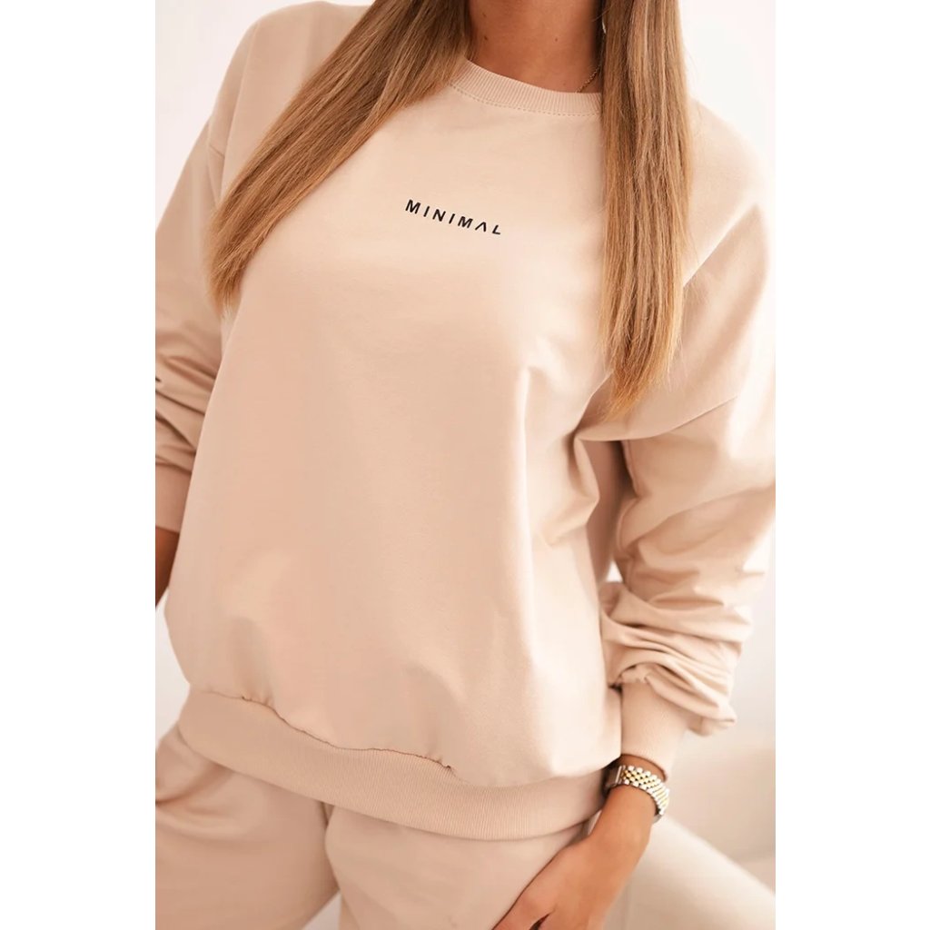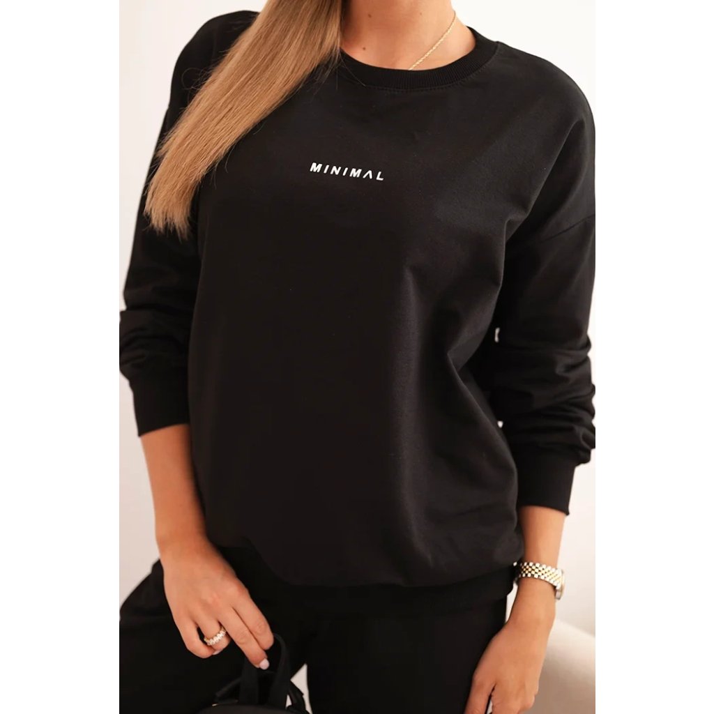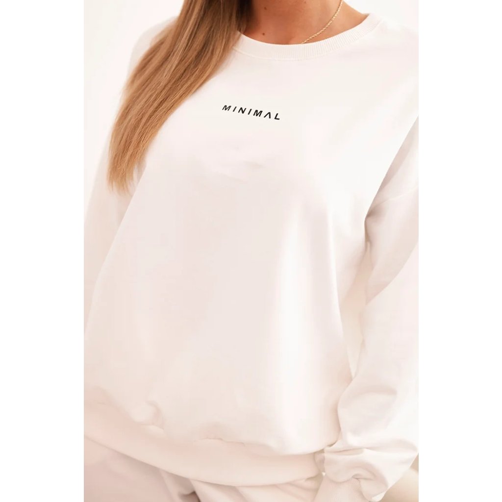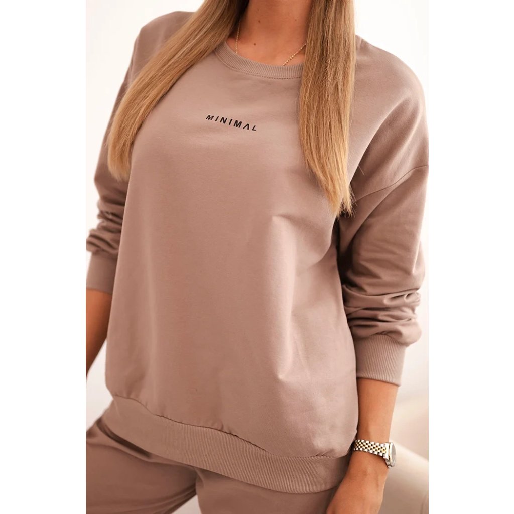 Vsadíte na komfort a nadčasový styl s dámským teplákovým setem s nápisem MINIMAL. Mikina volného střihu s kulatým výstřihem a dlouhým rukávem se skvěle hodí pro každodenní nošení, a kalhoty s elastickým pasem zajišťují pohodlí a volnost pohybu. Díky decentnímu designu bude tento set ideální jak na relaxaci doma, tak na procházku nebo nákupy.