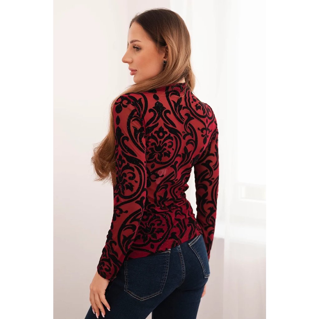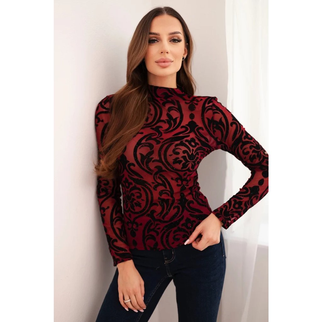 Dámská blůza bordó s sametovým vzorem a stojáčkem