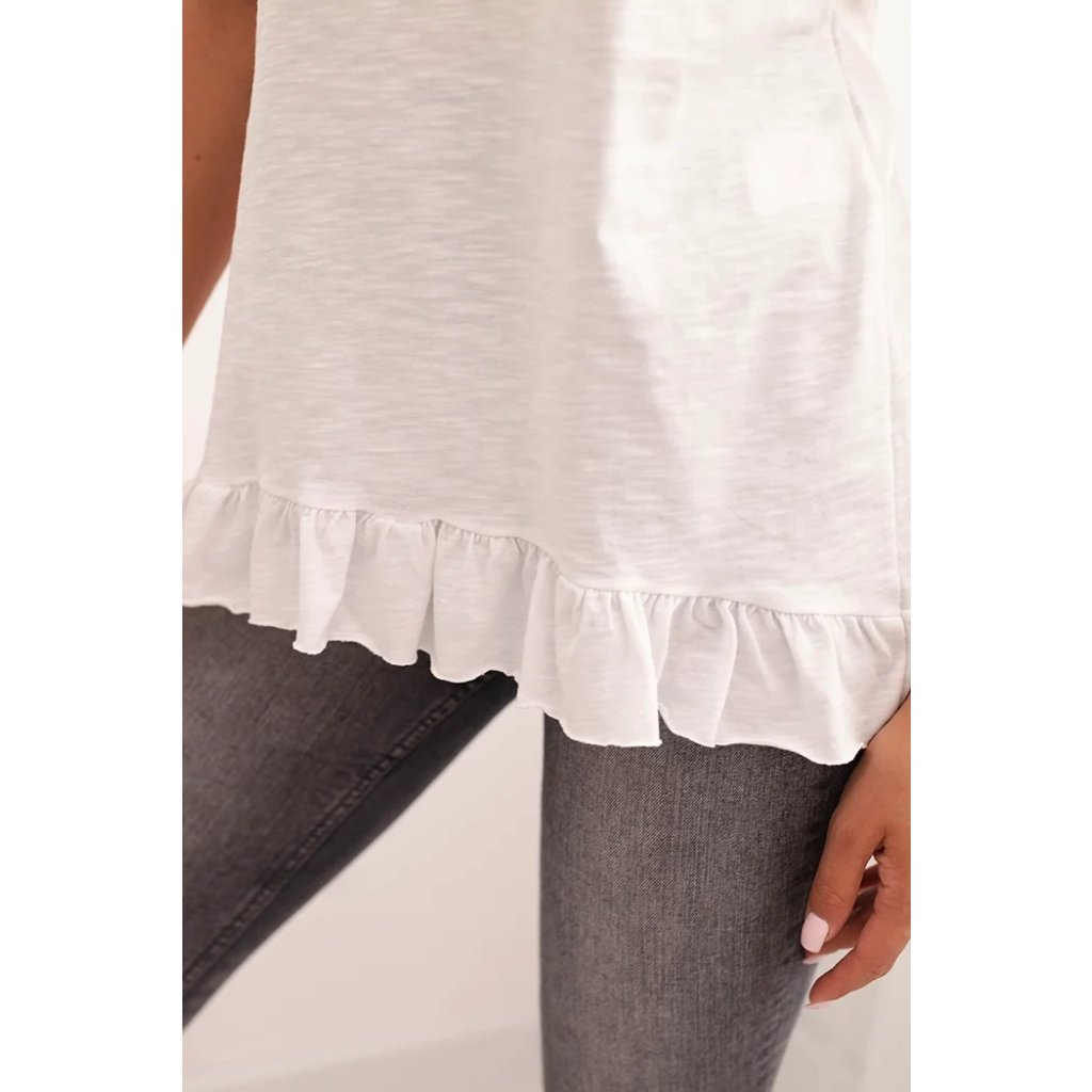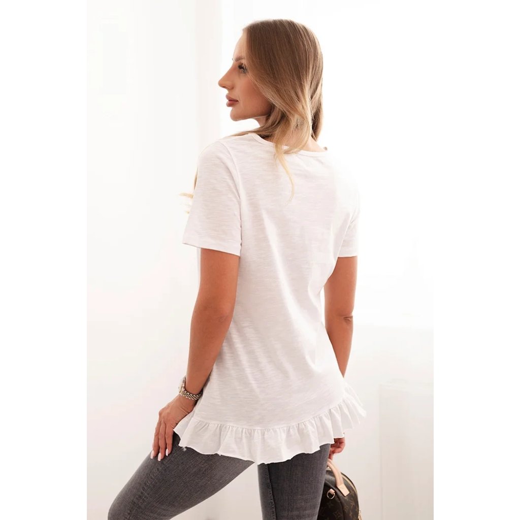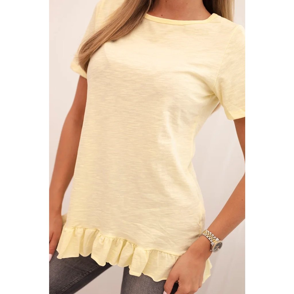 Sáhněte po dívčím kouzlu a pohodlí v každodenních stylizacích! Tato dámská blůza s krátkým rukávem a volánkem na spodním okraji je skvělým návrhem na léto a jaro. Lehce, prodyšný materiál z čisté bavlny zajišťuje vysoký komfort nošení, a jemný volánek dodává celku subtilní charakter.