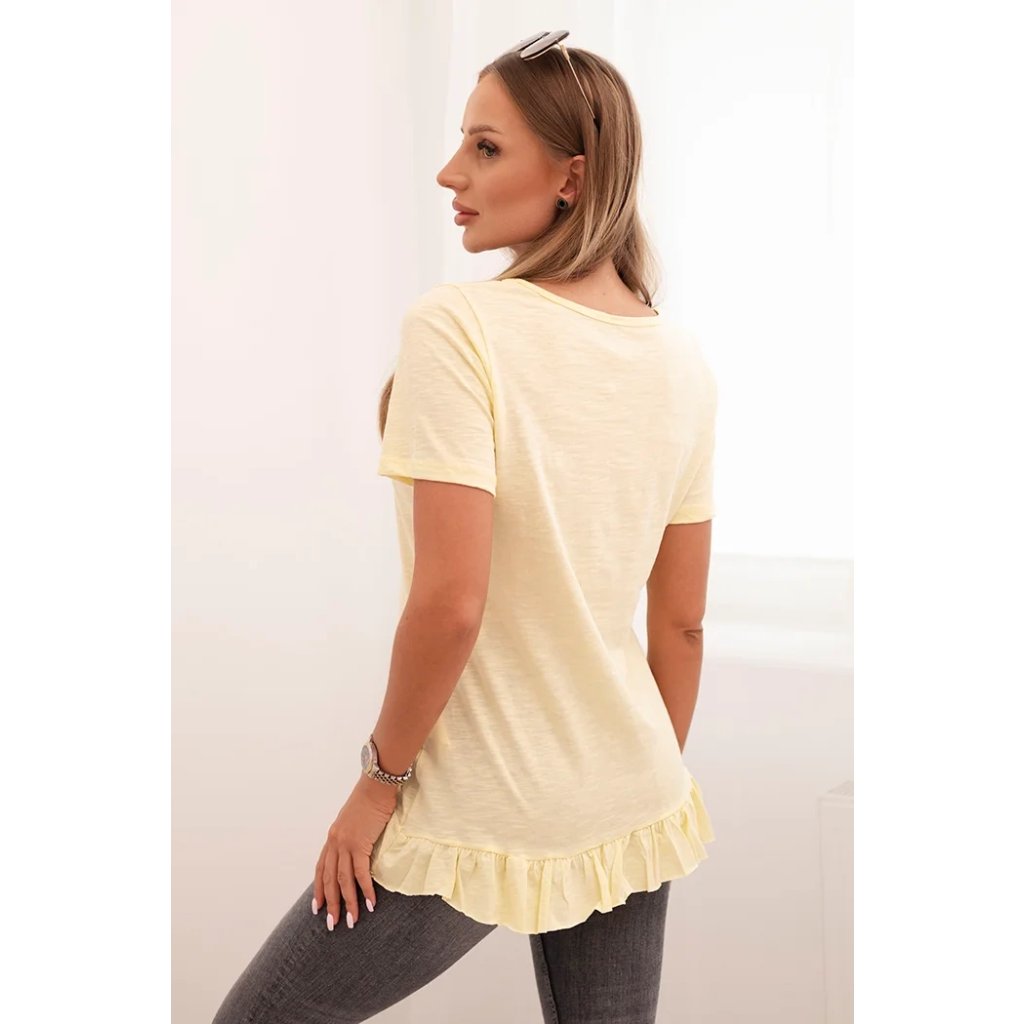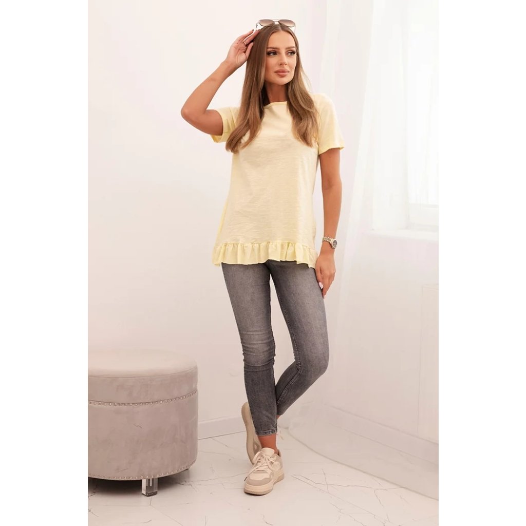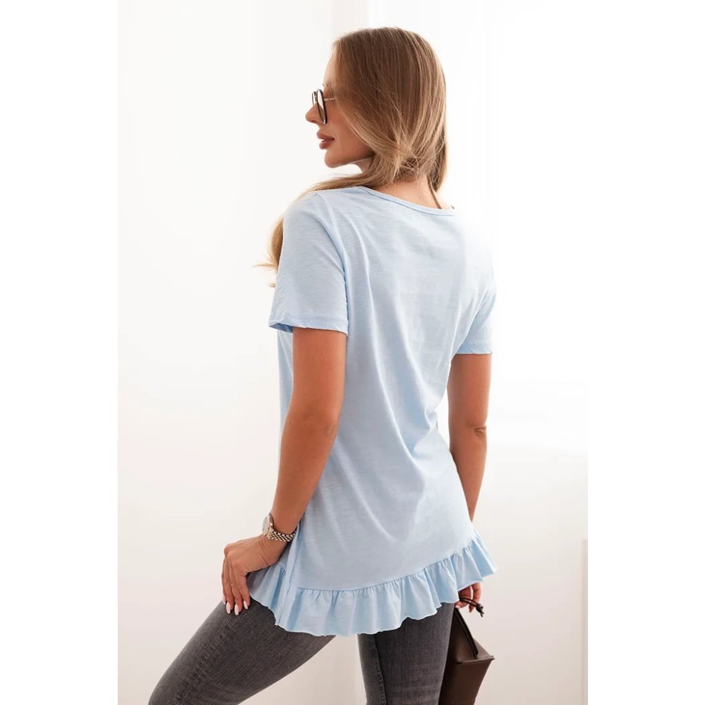Sáhněte po dívčím kouzlu a pohodlí v každodenních stylizacích! Tato dámská blůza s krátkým rukávem a volánkem na spodním okraji je skvělým návrhem na léto a jaro. Lehce, prodyšný materiál z čisté bavlny zajišťuje vysoký komfort nošení, a jemný volánek dodává celku subtilní charakter.