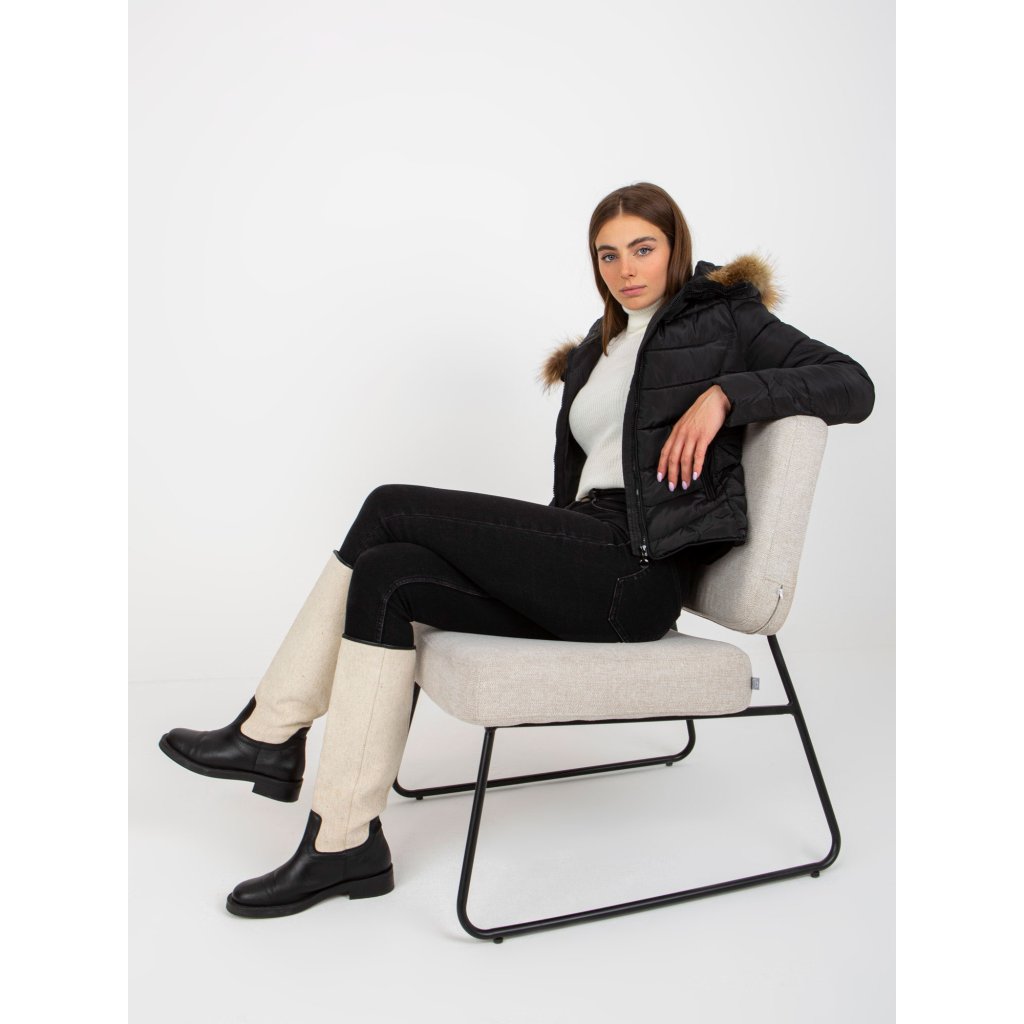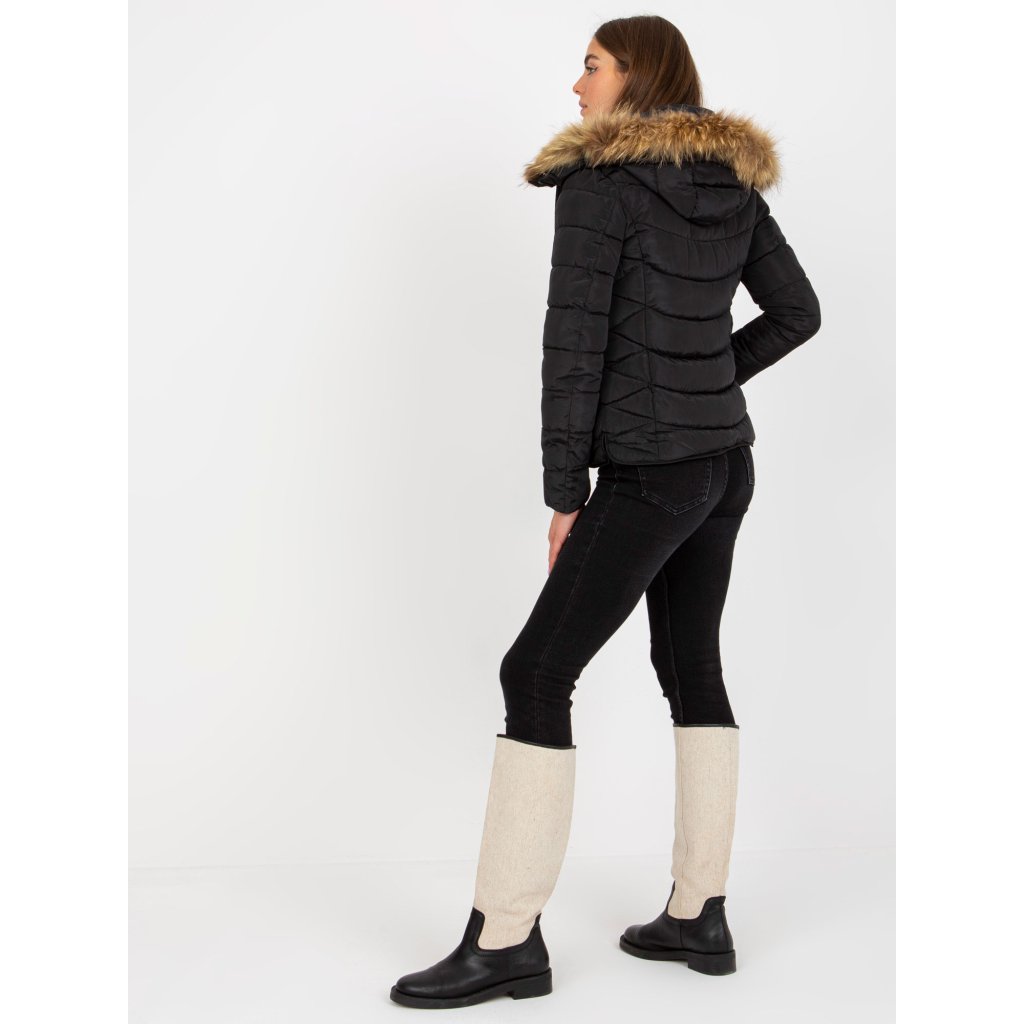 Černá prošívaná bunda pro volný čas s kožešinovým lemem na kapuci.