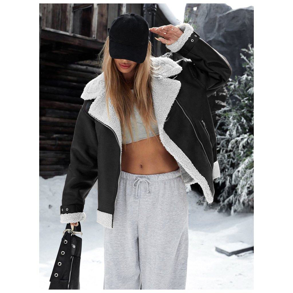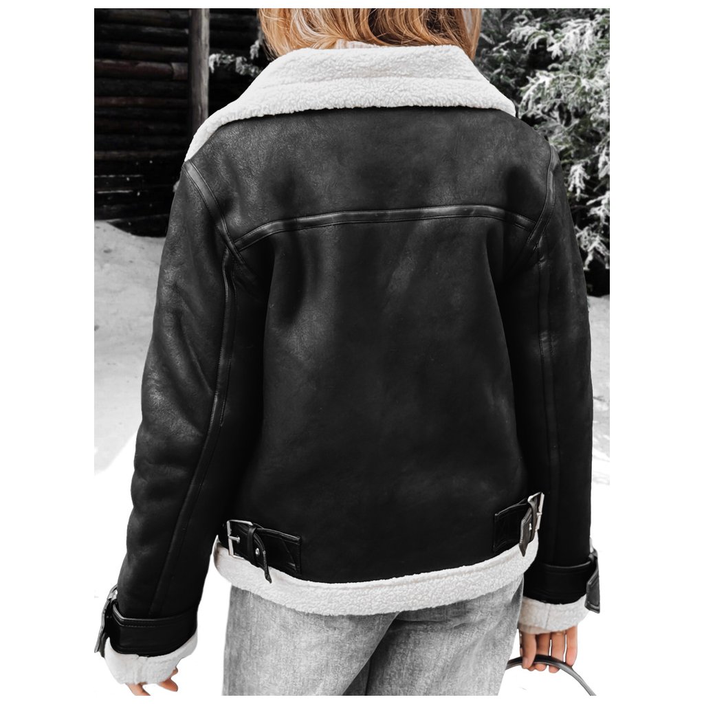 Měkká podšívka z ovčí kůže zlepšuje izolaci, díky čemuž je bunda ideální pro přechodná roční období. Kovové přezky a detaily na zipech dodávají bundičce charakter a usnadňují sladění outfitu s danou příležitostí.