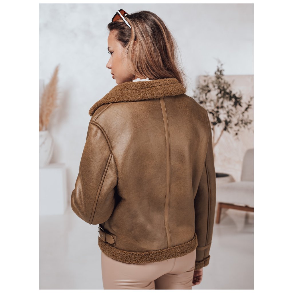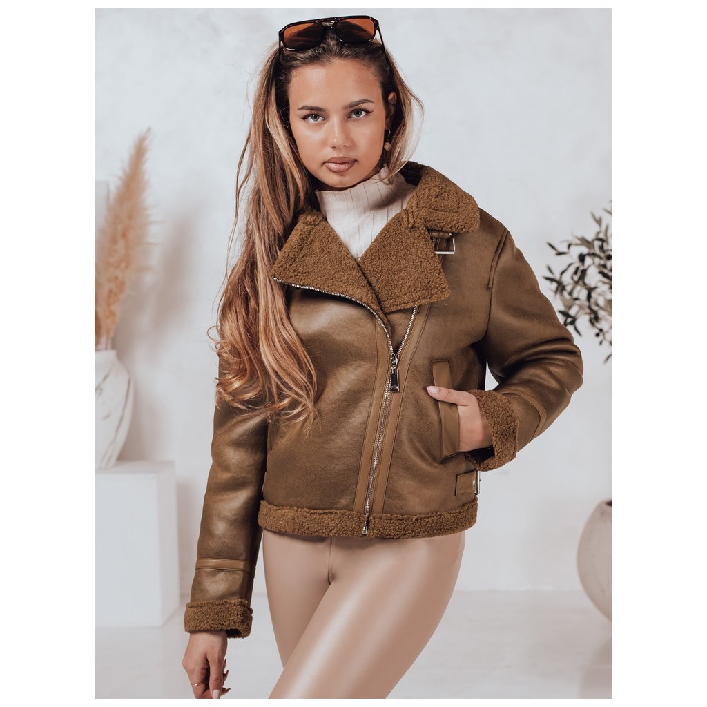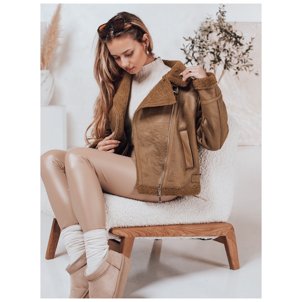 Dámská krátká bunda. Bez kapuce. Zapínání na zip. Dvě vnější kapsy. Podšívka z ovčí kůže. Barva: Camel. Složení: 100% polyester. Podšívka: 100% polyester. Míry modelky: