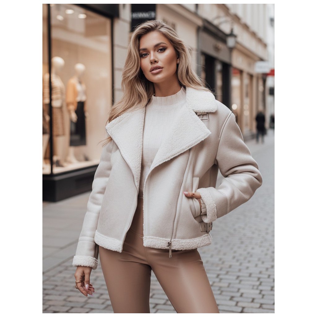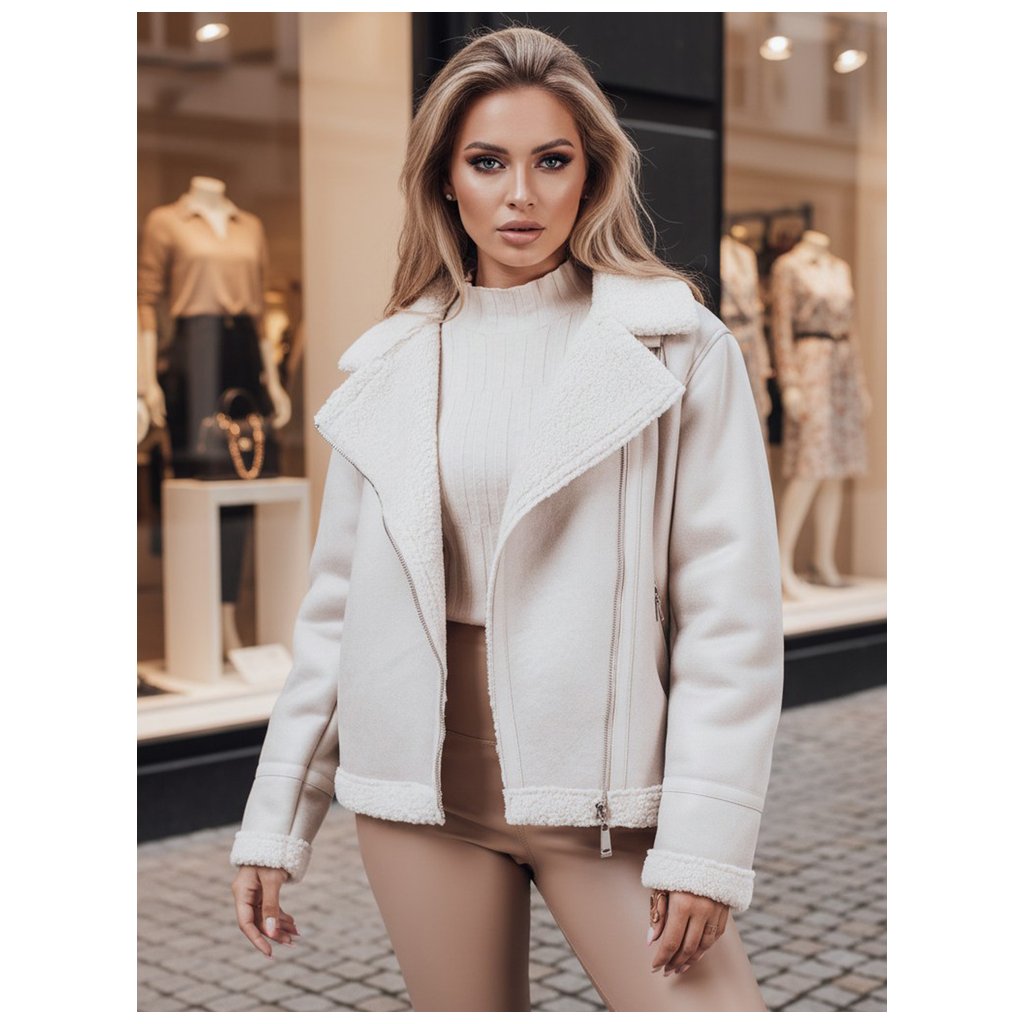 Dámská krátká bunda. Bez kapuce. Zapínání na zip. Dvě vnější kapsy. Podšívka z ovčí kůže. Barva: Bílá. Složení: 100% polyester. Podšívka: 100% polyester. Míry modelky:
